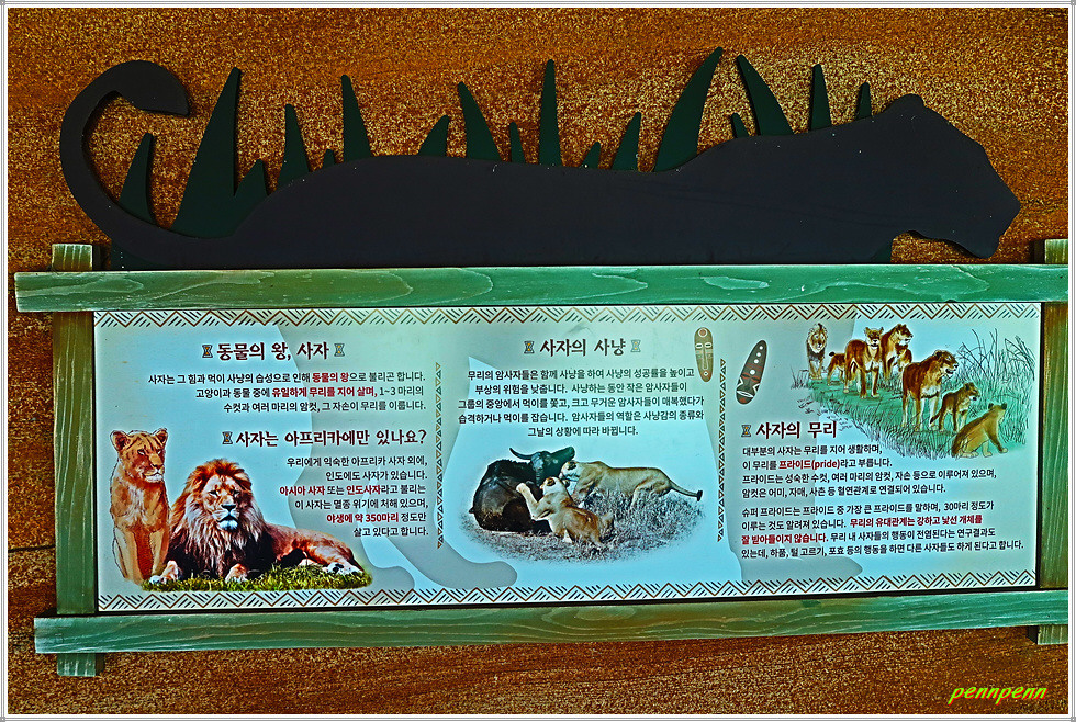 <제3아프리카관> 앞의 사자상은 서울시와 중국 베이징시와의 친선 15주년을 기념해 베이징 시에서 직접 제작해 기증한 것입니다. 제3아프리카관에는 하이에나, 치타, 사자, 세이블앤틸롭이 살고 있습니다. 세이블앤틸롭이라는 동물은 이름도 생소하고 매우 특이한데 초식동물로 우리나라 동물원 중 이곳에서만 산다는군요. 다만 사자우리에서 사자를 직접 목격하지 못해 못내 서운했습니다.