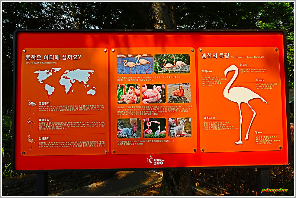 이름을 알 수 없는 귀여운 동물상을 지나면 바로 <홍학사>인데 홍학이 한쪽에 옹기종기 모여 있군요. 홍학은 황새목 홍학과에 속한 미국큰홍학, 갈라파고스홍학, 큰홍학, 칠레홍학, 쇠홍학 따위를 통틀어 이르는 말입니다. 홍학은 목과 다리가 매우 길고 주둥이는 짧은데 끝이 아래쪽으로 꼬부라졌으며, 몸빛은 연분홍빛을 띱니다. 여러 마리가 떼 지어 물가에 살며, 무리를 이루어 춤을 춥니다. 이들은 연체동물, 갑각류, 곤충, 조류 등을 먹고 살며, 아프리카, 남유럽, 중앙아시아, 아메리카 열대 지방 등지에 분포합니다.(자료/다음백과).