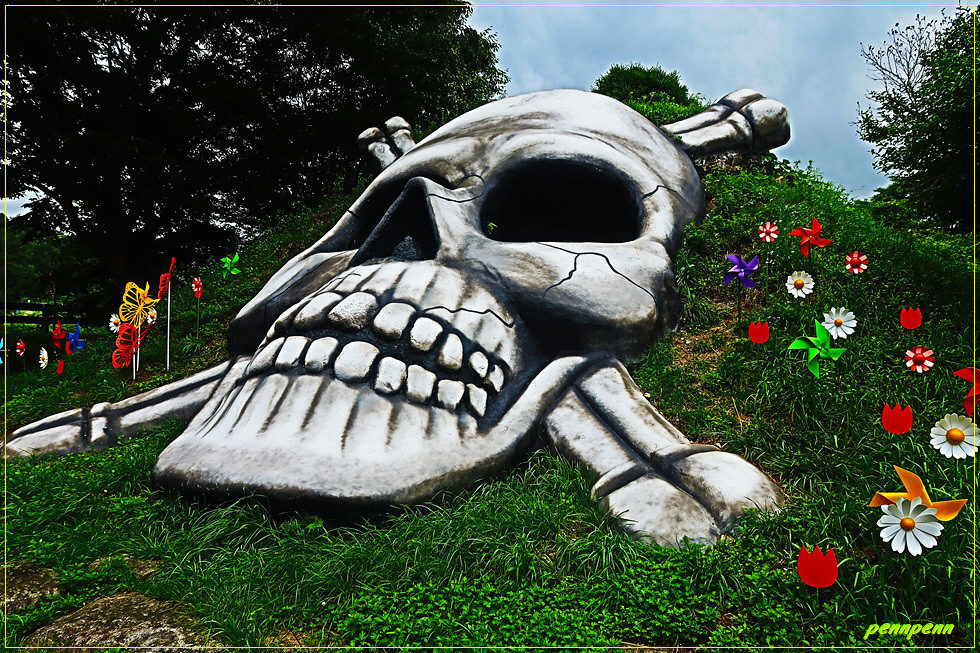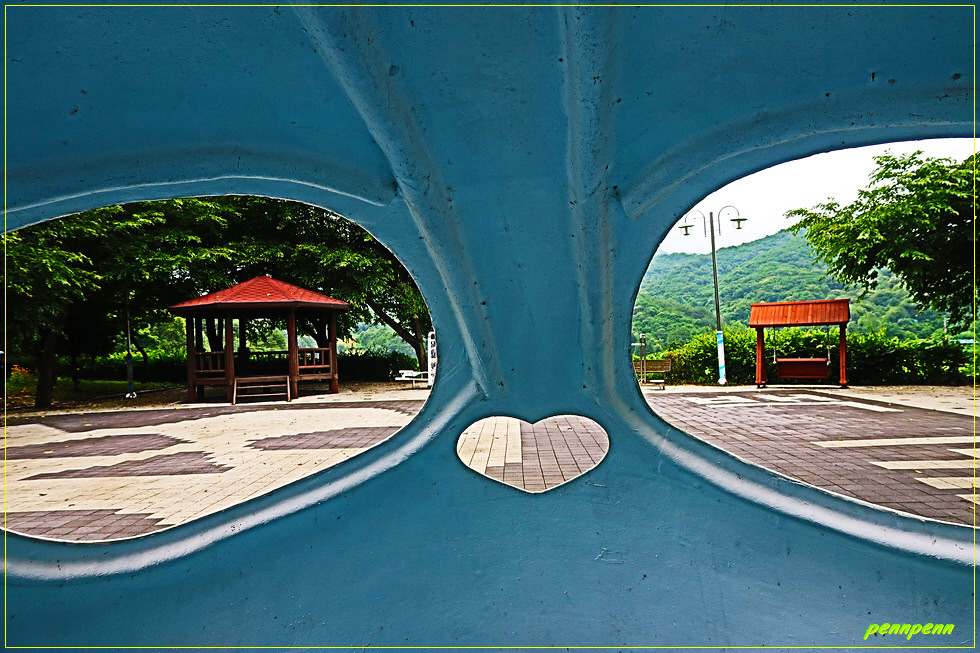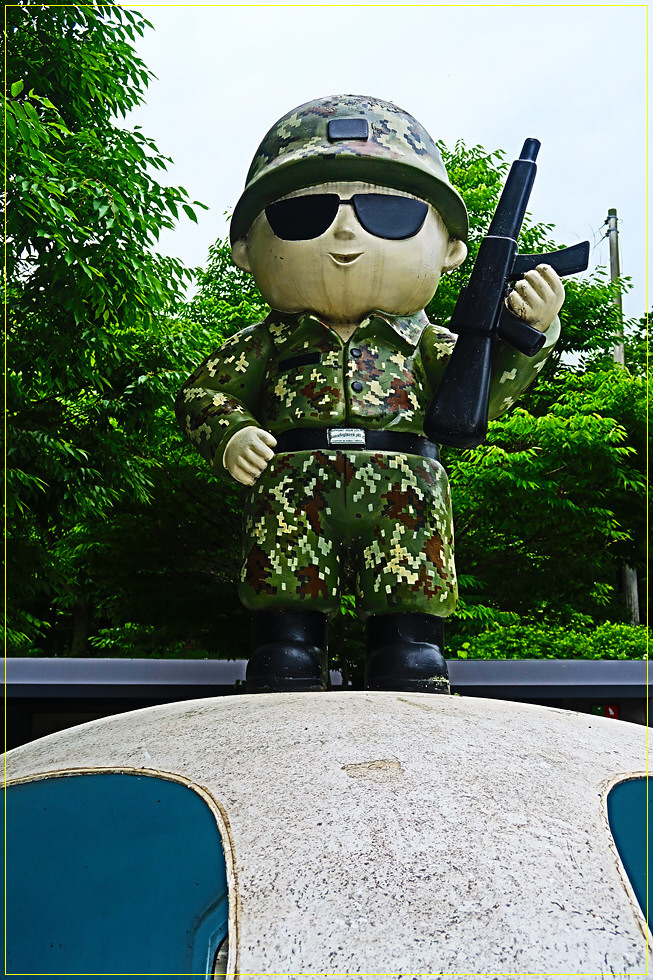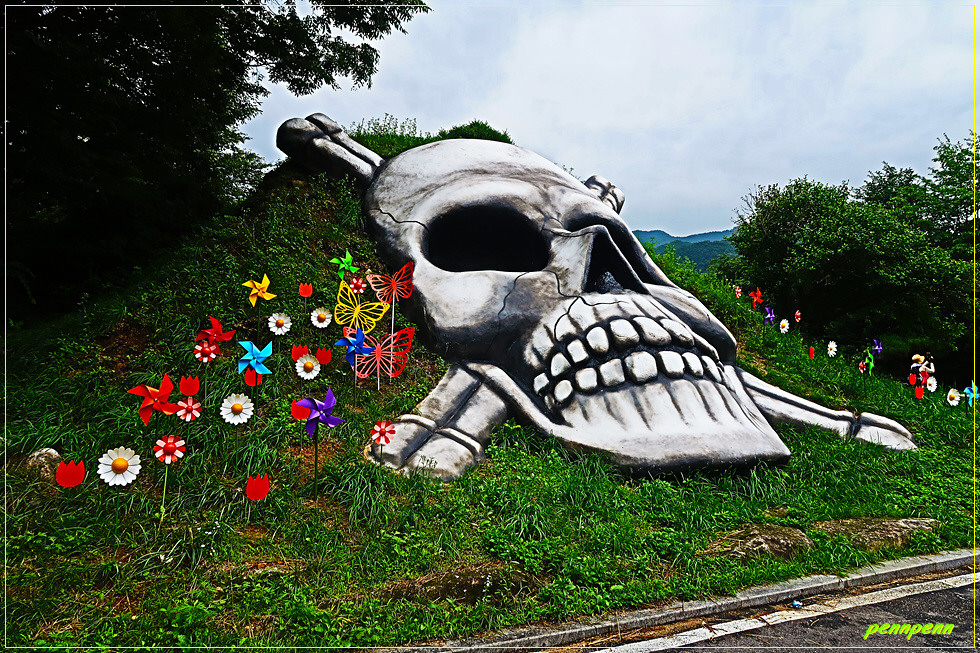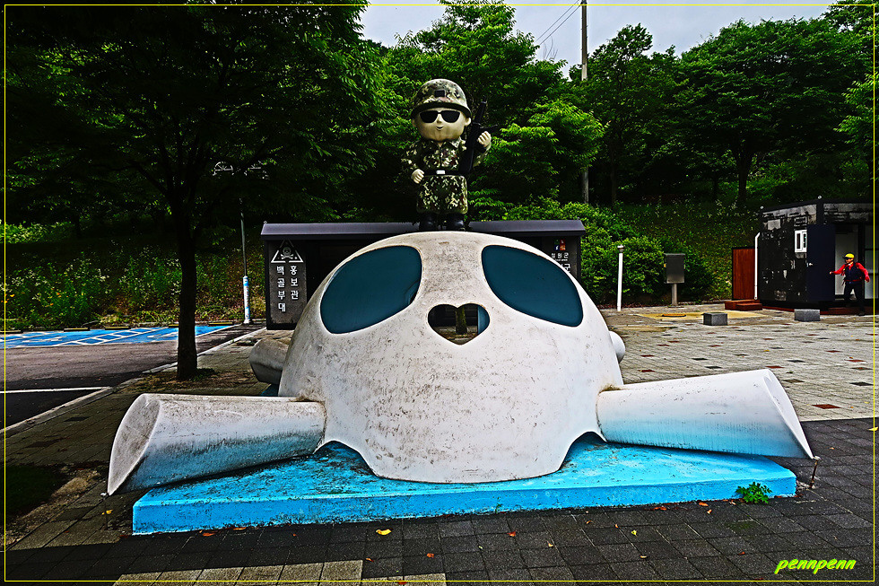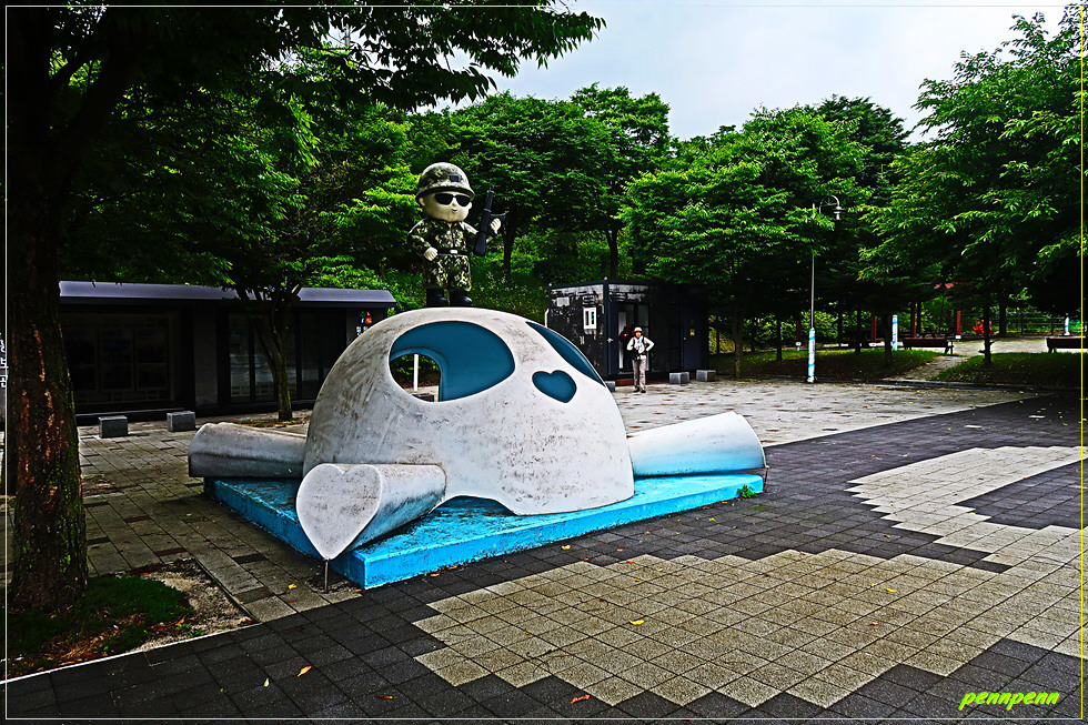 공원 중앙에는 백골상과 부대장병을 익살스럽게(?) 풍자한 조형물이 설치되어 있어 방문객들은 백골상 안으로 들어가 사진을 촬영할 수도 있습니다. 백골상의 코가 하트로 제작한 것도 이를 친근하게 표현한 것으로 보입니다. 사실 해골을 보면 좀 무서운 느낌이 드는데 철원 백골상은 씩씩한 기운을, 여기 조형물은 장난감 같은 모습이어서 웃음이 나오는군요.