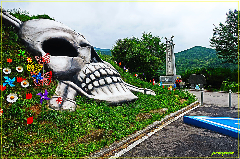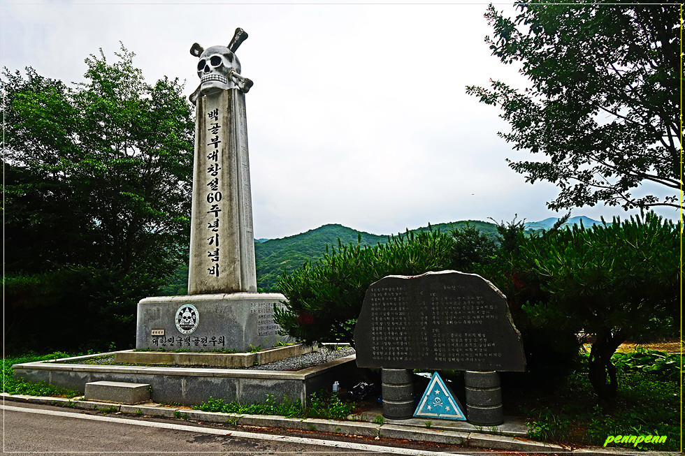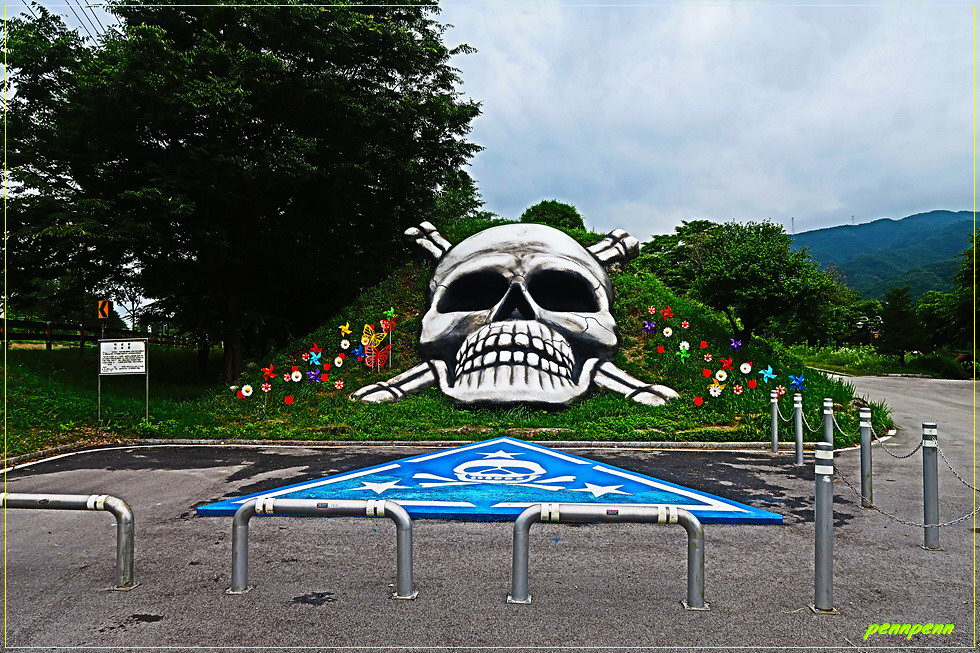 공원 입구에는 대형 백골상(白骨像)이 있군요. 백골부대는 철원군 소재 육군 제3보병사단의 상징명칭으로 경례구호는 백골입니다. 6.25전쟁이전 공산당의 만행에 참고 견디다 못해 월남한 서북청년회 출신 청년들이 자진 입대하여 주축을 이룬 당시 수도사단 소속 제18연대 병사들이 죽어서 백골이 되더라도 공산당과 싸워 조국을 수호하겠다는 의미로 철모에 백골을 그려 넣게 되자 이를 백골부대로 불렀습니다. 그러다가 1950년 12월 제18연대가 흥남 철수작전 때 수도기계화보병사단에서 3사단으로 배속되었고 6.25 전쟁이 끝나고 아예 사단애칭을 사자부대에서 더 전투적인 이미지의 백골부대로 변경한 것으로 전해집니다.(자료/위키백과).
