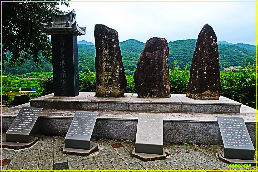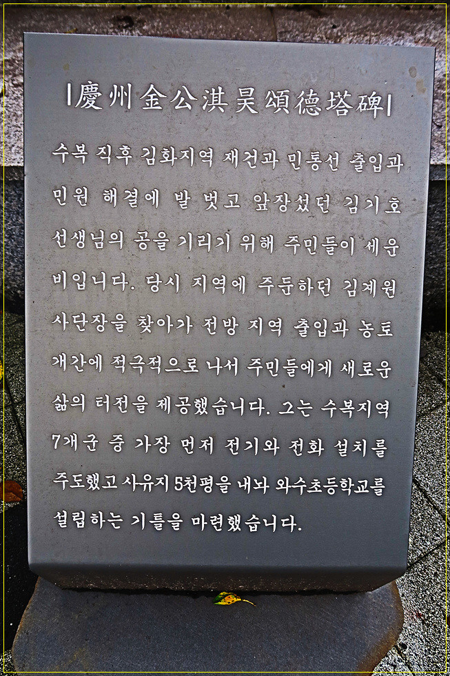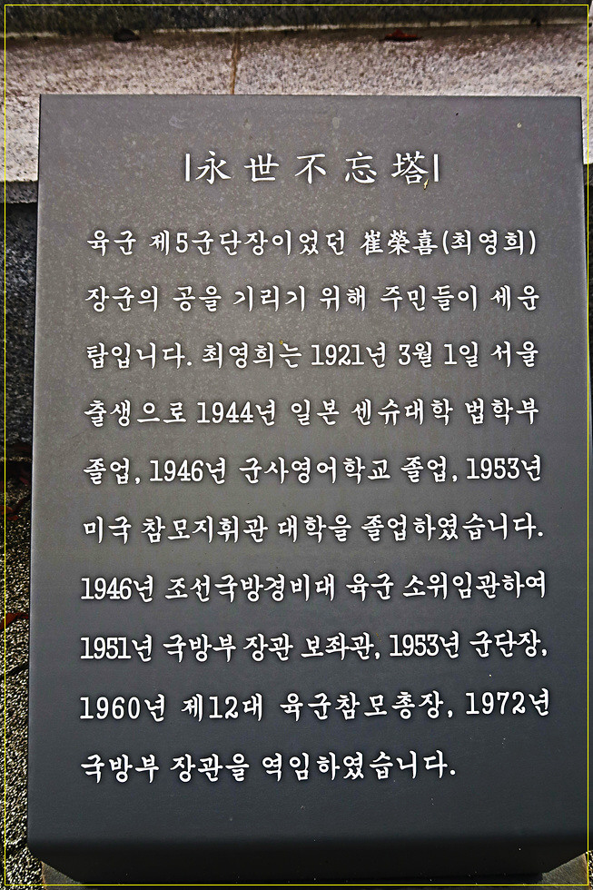 안으로 들어서면 주차장과 공원입니다. 먼저 4기의 비석이 나란히 세워져 있는데요. 이는 경주 김기호 송덕탑비(수복 직후 김화지역 재건, 민통선 출입 및 민원해결 유공), 조혁환 장군 송덕비(조혁환 보병 제3사단장의 혁혁한 전공), 보은탑(육군 27사단장 김계원 장군의 공적 기념), 영세불망탑(육군 제5군단장 최영희 장군 공적 기념)으로 모두 주민들이 세운 송덕비입니다.