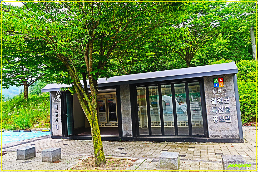 이 조형물 뒤쪽에는 백골부대 홍보관과 철원군 특산물 홍보관이 있습니다. 부대 홍보관에는 백골부대의 연혁과 정신 그리고 백골부대 5대 자랑거리가 기록되어 있군요. 이를 살펴보면 ① 전국 최초로 창설된 사단급 부대, ② 38선 최전선돌파와 국군의 날 제정기원, ③ 전쟁 중 한반도 최북단 진격기록, ④ 전국 유일의 DMZ 완전 작전부대, ⑤ 북한군이 가장 두려워하는 부대로 백골부대는 중부전선 최전방을 수호하는 대한민국 국군의 자존심입니다. 철원특산물홍보관에는 오대쌀, 토마토, 파프리카 등을 소개하고 있네요. 공원의 꽃밭에는 루드베키아가 지천으로 피어 있습니다.