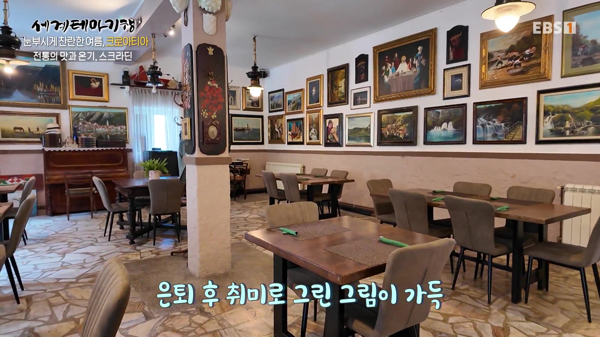 스크라딘은 크라카강 인근의 작은 강변도시로 크로아티아 남부의 대표적인 역사도시입니다. 17-18세기에 지어진 이곳에는 대표적인 맛집이 많은데 전통요리를 하는 식당을 찾았습니다. 내부를 미술관처럼 꾸며 놓았는데 모두 주인이 취미로 그린 그림입니다. 페카는 이 나라 국민요리로 숯불을 이용해 천천히 익히는 방식입니다.