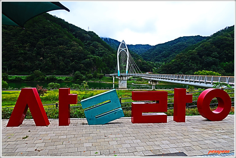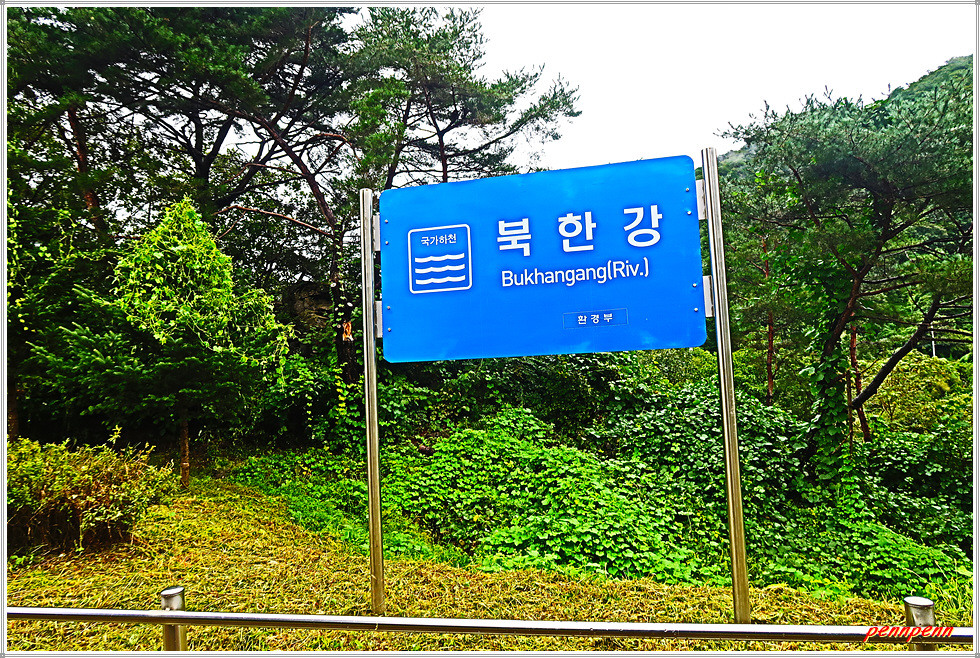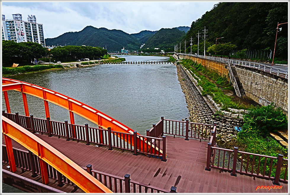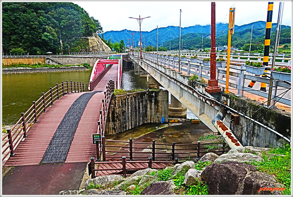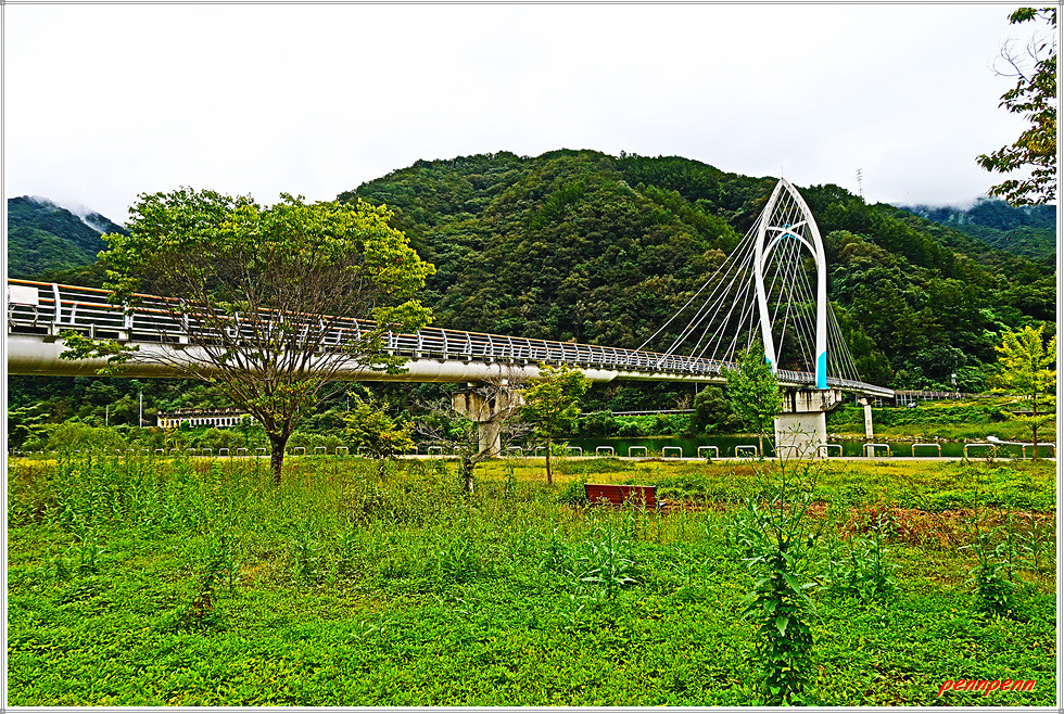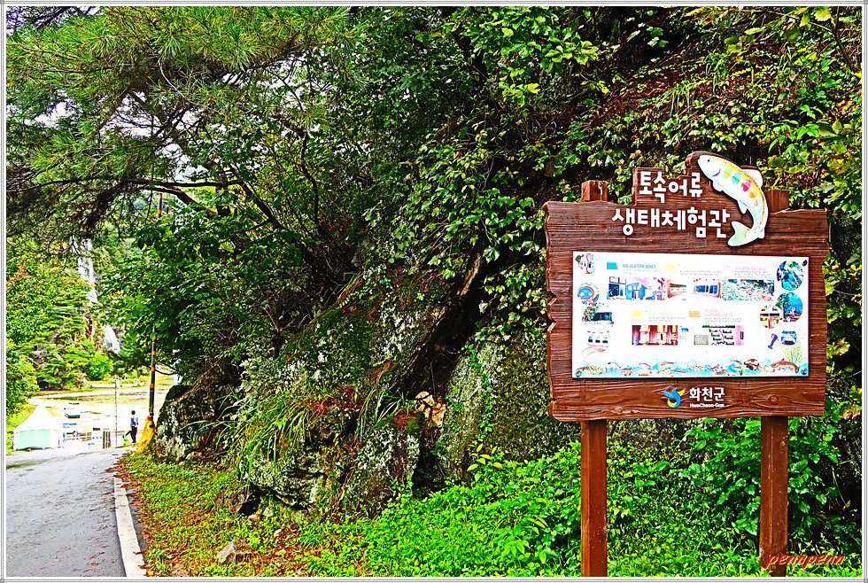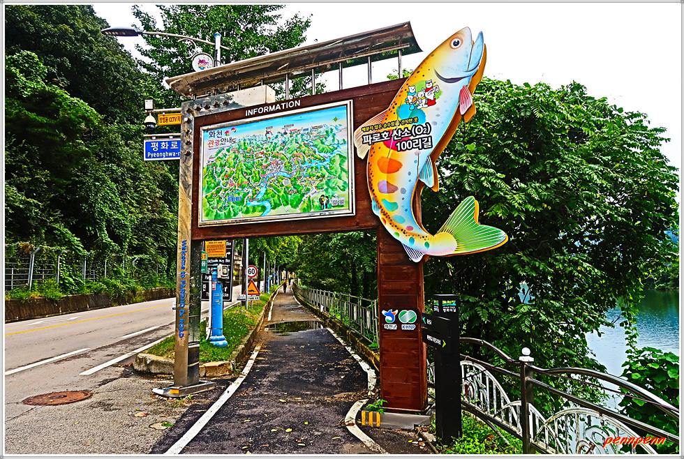 여기서 화천교를 건넙니다. 화천교는 화천천이 북한강과 합류하는 지점을 가로지르는 교량으로 화천교 북쪽에는 인도교가 별도로 설치되어 있습니다. 화천교를 건너며 북쪽을 바라보면 산천어축제가 열리는 화천천의 물결이 고요합니다. 북한강변 평화의 길 입구에는 “파로호산소 100리길”이라는 입간판이 세워져 있네요. 트레킹 길은 461번 지방도로(평화로) 우측 한강변을 따라 별도로 조성되어 있는 게 도로변을 걷는 이들에게는 참으로 고마운 일입니다.