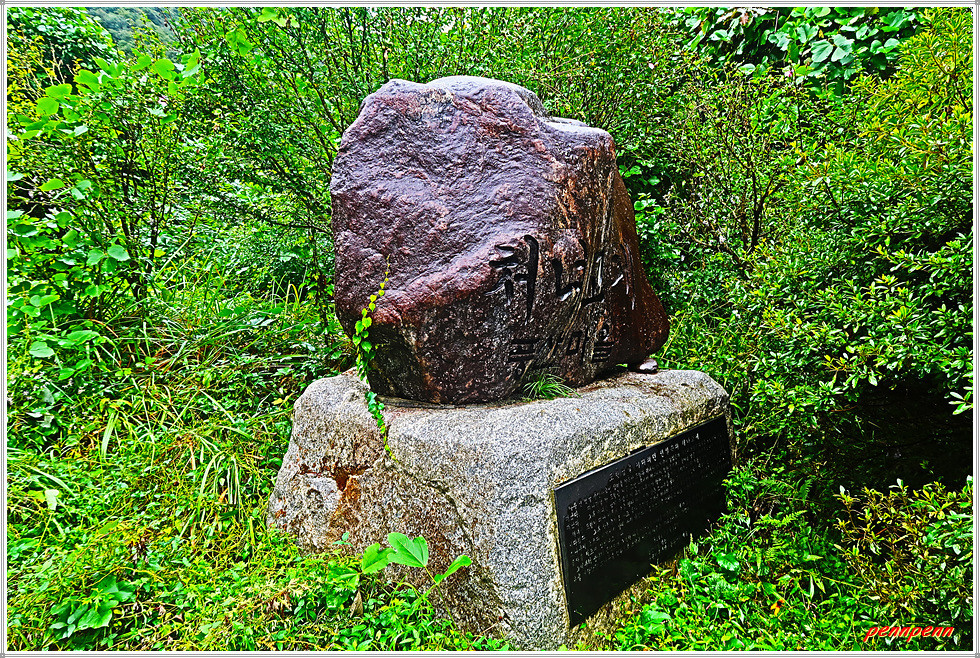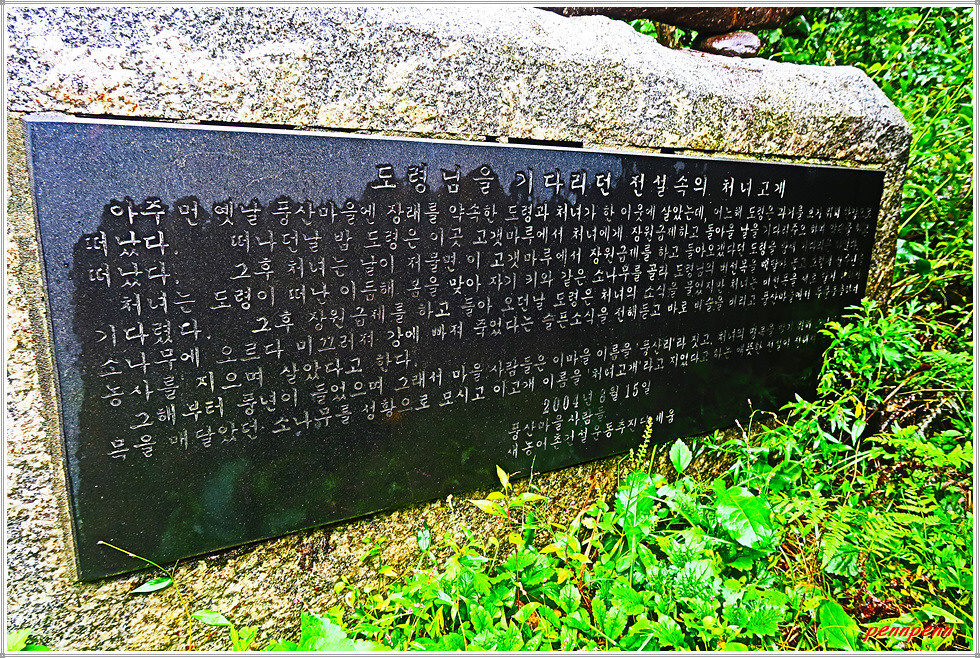 입구로 나와 평화로를 걸어 북상합니다. 길이 구부러지는 풍산천변 도로에 처녀고개 전설표석이 있습니다. 아주 먼 옛날 풍산마을에 장래를 약속한 도령과 처녀가 헤어져 과거길에 오른 선비가 과거에 급제하여 마을로 돌아왔으나 처녀는 도령을 기다리다 이미 죽었다는 소식을 듣고 낙담하여 관직을 포기하고 그 처녀를 그리워하면서 이 마을에 정착하여 농사를 지으며 살게 되자 이후로는 매년 풍년이 들어 풍산마을이라고 불리게 되었으며 마을사람들은 이 고개를 처녀고개로 불렀습니다.(자료/현지 안내문).