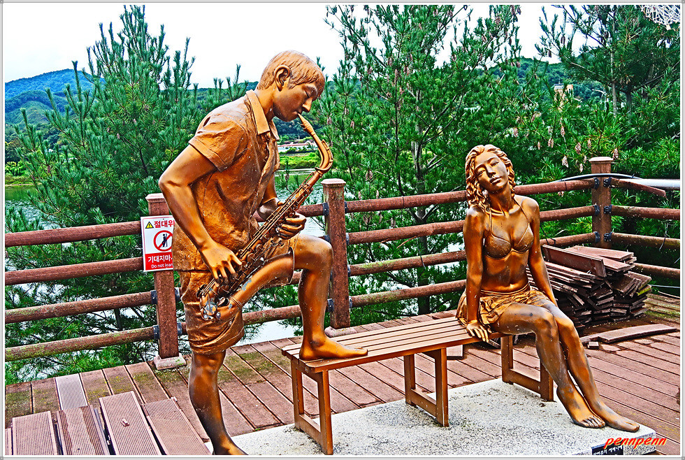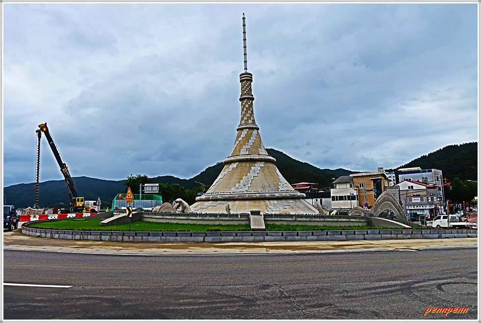 21코스의 출발지는 화천군 화천읍 화천대교 북단 오거리(회전교차로)입니다. 북한강변에는 동화 속에서 봄직한 각종 조형물이 설치되어 있어 방문객을 유혹하지만 유감스럽게도 현재 북한강을 가로지르는 노후화된 화천대교를 대체하기 위한 신화천대교 개설공사 중으로 공사용자재가 어지럽게 놓여 있어 사진을 담기가 참 어렵습니다.