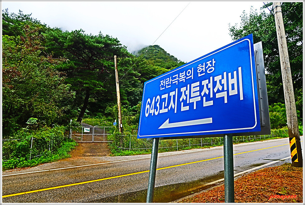 꺼먹다리를 지나면 도로맞은편 언덕(50여 미터 지점)에 643고지 전투전적비가 있다는 이정표가 세워져 있습니다. 그런데 전적비 입구는 철문이 닫혀 있네요. 수리봉(643고지)지구 전투전적비는 6.25 한국전쟁당시 중공군 제20군 예하 제58, 제60, 제151의 3개 사단이 화천댐과 발전소를 탈환키 위해 대규모 침공을 감행해 왔으나 국군 제6사단과 미군 제17연대가 합동작전을 펼쳐 적의 포연과 탄우를 무릅쓴 치열한 백병전 끝에 최후까지 고지를 사수한 전공을 기념하기 위해 1957년 육군 제2군단에서 건립한 전적비입니다.