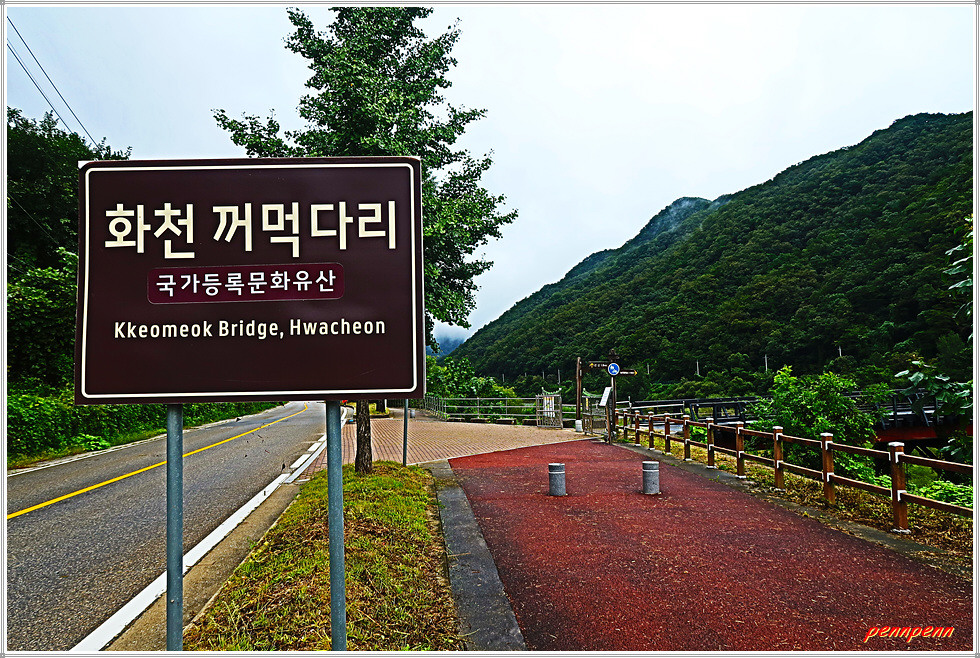 이어지는 명소는 국가등록문화유산인 화천 꺼먹다리입니다. 화천군 화천읍 대이리 소재 꺼먹다리는 화천댐이 준공되면서 1945년에 건설된 다리로서, 나무로 만든 상판에 부식을 막기 위해 검은색 콜타르를 칠해 “꺼먹다리” 라는 이름이 붙었습니다. 화천수력발전소와 함께 당시의 산업을 엿볼 수 있는 시설물이며 건립 당시의 원형을 잘 간직하고 있어 근대 가구식 구조 교량사 연구에 중요한 자료로 평가받습니다. 한국전 당시 중동부전선을 연결시켜주는 중요한 교량이었기 때문에 전투도 치열했던 곳이며, 일제강점기 때에는 소양강과 화천간 모노레일을 이용해 물자를 수송했습니다.