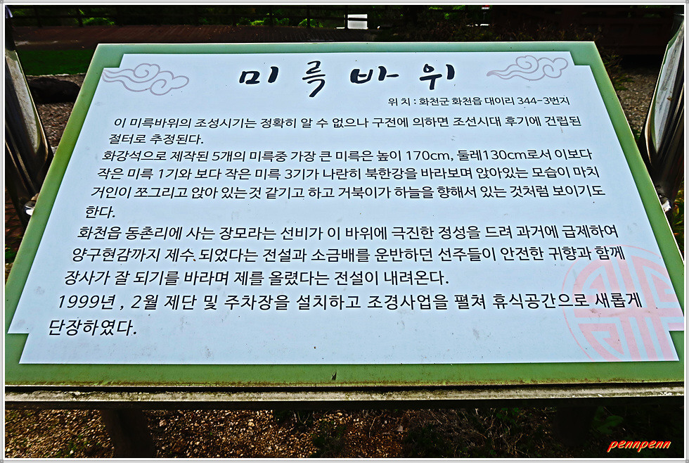 화천군 화천읍 대이리 소재 미륵바위는 조선 후기에 세워진 절터(미륵터)로 추정되는 곳에 있는 5개의 바위(오형제바위)를 말합니다. 옛날 과거를 보러가던 선비가 미륵터 근처에서 잠을 자는데 꿈속에 미륵동자가 나타나 시(詩) 구절(句節)을 읽어 주었고 이게 과거시험의 시제(詩題)와 같아 선비가 과거에 장원급제한 후 이곳에 미륵을 세웠다는 전설이 전해지고 있으며 화천주민들이 소원을 빌었다는 바위입니다.