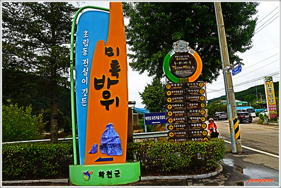 도로변 숲에는 생태교란종이라는 가시박이 숲을 뒤덮고 있어 정말 앞으로 숲의 생태계가 크게 훼손될 것 같아 걱정입니다. 북한강변에는 카누와 수상스키를 할 수 있는 선착장이 있군요. 아취형 나무다리를 건너니 좌측에 규모가 상당히 큰 화천실내체육관이 보입니다. 화천눈개승마 집단재배지를 지나 좌측 도로변으로 오르면 미륵바위입니다.