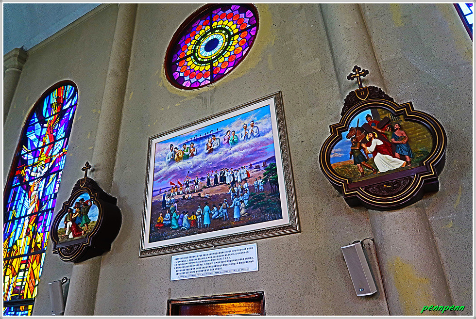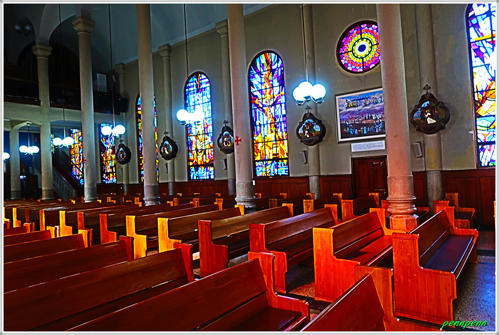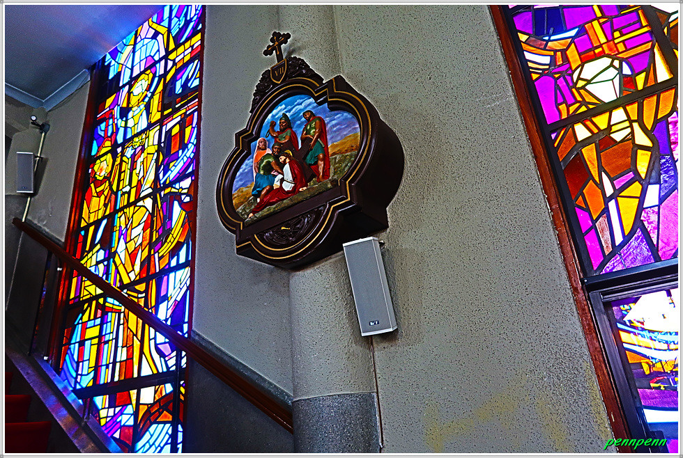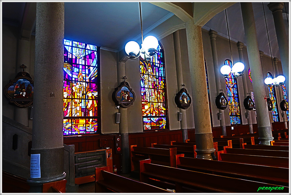 성당 안으로 진입합니다. 내부의 유리창문은 스테인드글라스로 장식되어 매우 화려합니다. 벽면의 액자에는 성화가 그려져 있지만 내부가 어두워 사진을 잘 찍을 수 없음이 옥의 티입니다.