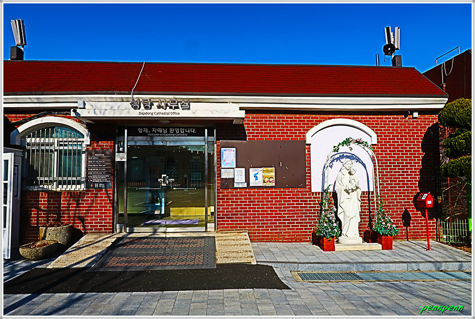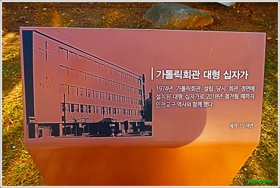 성당 좌측에는 천주교 인천교구 역사관이 있습니다. 진입로에는 가톨릭회관 대형십자가가 전시되어 있고, 그 옆에는 파리외방전교회 마라발형제 선교사 경당이 있습니다. 이웃한 천주교 인천교구 역사관은 답동성당의 옛 주교관으로 1901년부터 선교사들의 숙소로 사용되던 답동성당 부지 내 목조건물이었습니다. 1986년 교구 설정 25주년을 맞이해 새롭게 신축했으며 2018년 교구청이 신청사로 옮겨가기 전까지 초대 교구장과 2대교구장이 머문 장소입니다. 그런데 필자가 방문한 목요일은 휴관일이어서 내부를 살펴보지 못했습니다.