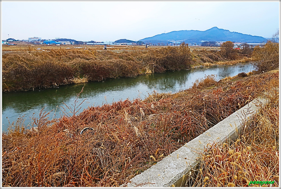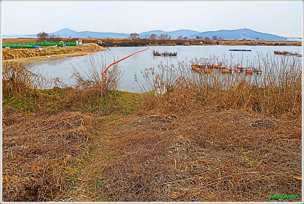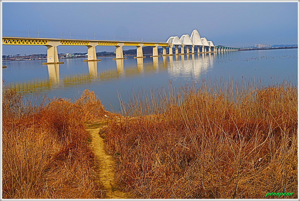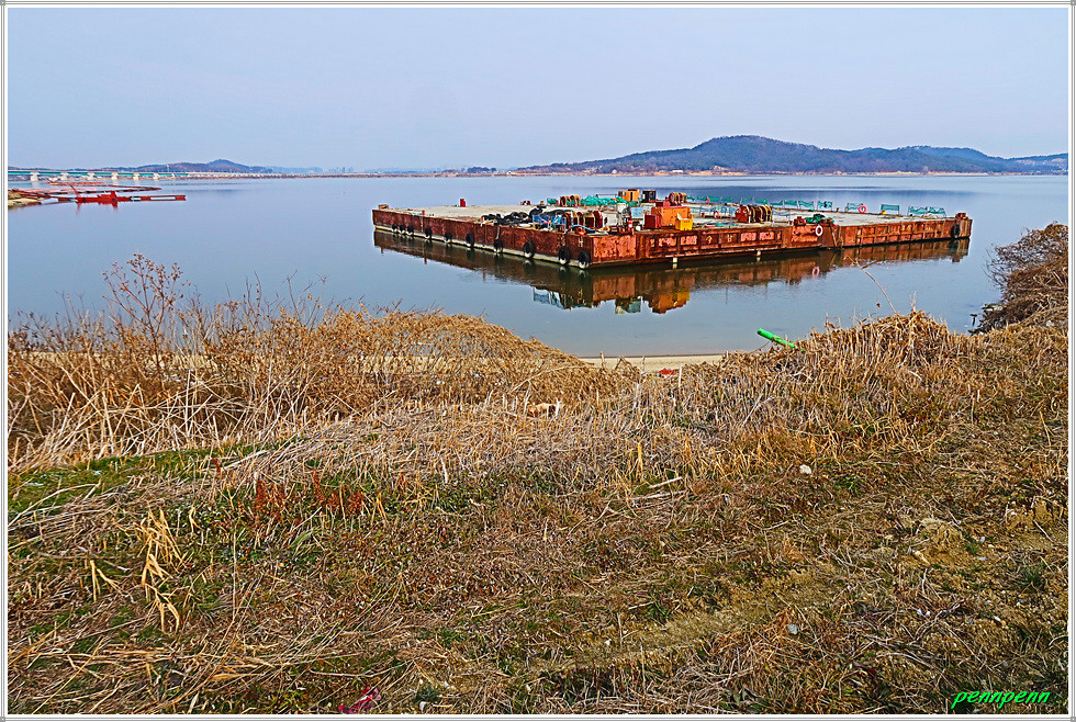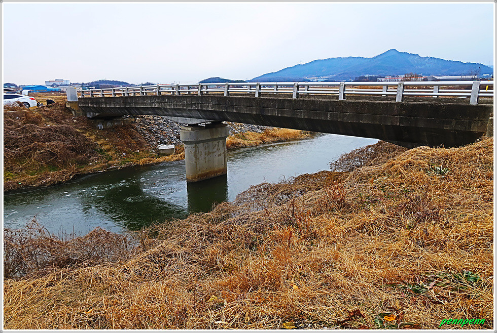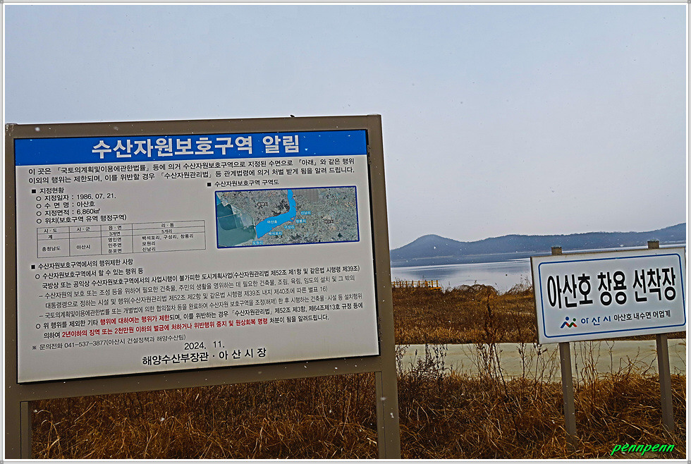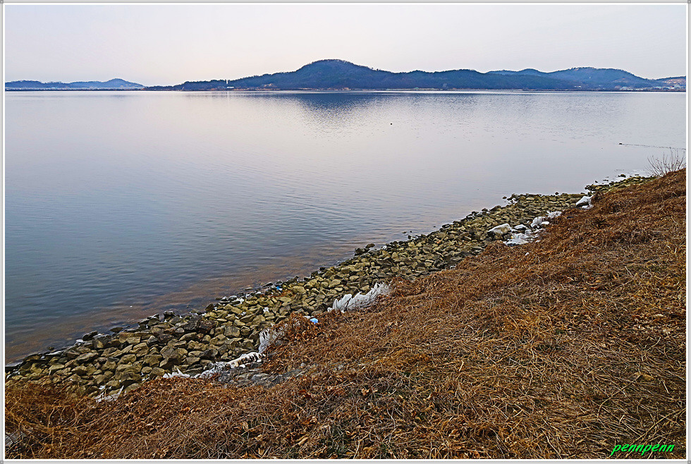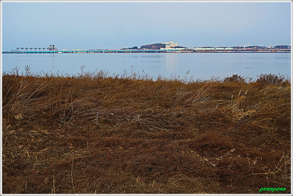 간이선착장을 뒤로하고 한참을 가면서 좌측에 철망이 있는 한국수자원공사 아산취수장을 지나갑니다. 이제는 갈대가 너무 늙었네요. 농경지의 농로를 따라 걷다가 개천(신언천)을 만나 우측으로 한참을 돌아가 교량을 건넙니다. 현재 하천환경정비사업 공사로 차량통행은 금지로군요. 아산호와 접한 신언천에는 현재 교량건설공사가 한창인데 내년 3월 준공예정이랍니다. 그 후에는 우회하지 않고 바로 다리를 건너면 거리를 단축할 수 있겠군요. 여기서 바라보는 아산호는 마치 바다 같습니다. 북쪽으로는 다음에 걸어야할 서해랑길 85코스의 호수변이 보이는군요.