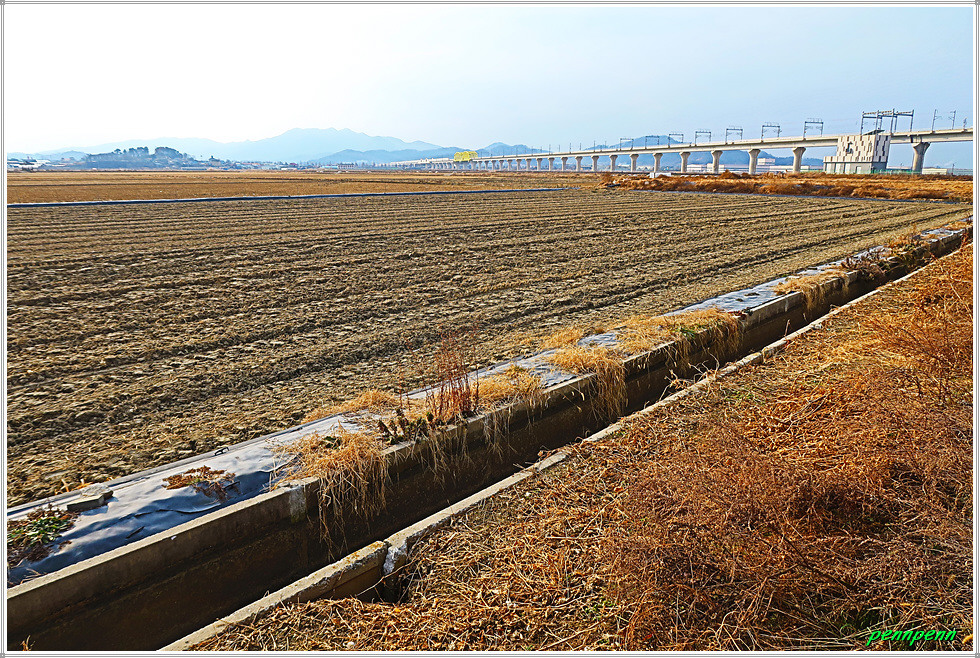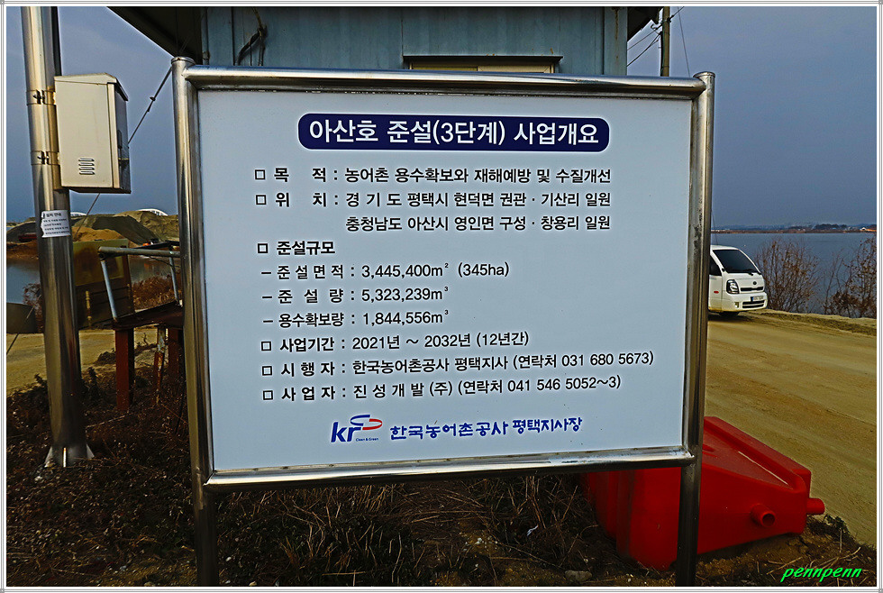 농경지에는 가축사료용 건초더미를 모아 놓았는데 곤포 사일리지 형식(대형 두루마리 모양)으로 포장을 하지 않은 게 이채롭습니다. 뒤돌아보니 서해선 철도의 고가교가 점점 멀어집니다. 인근에는 한국농어촌공사 평택지사에서 농어촌 용수확보와 재해예방 및 수질개선을 위해 무려 12년간(2021-2032)에 걸쳐 아산호에 대한 준설사업을 하고 있군요.