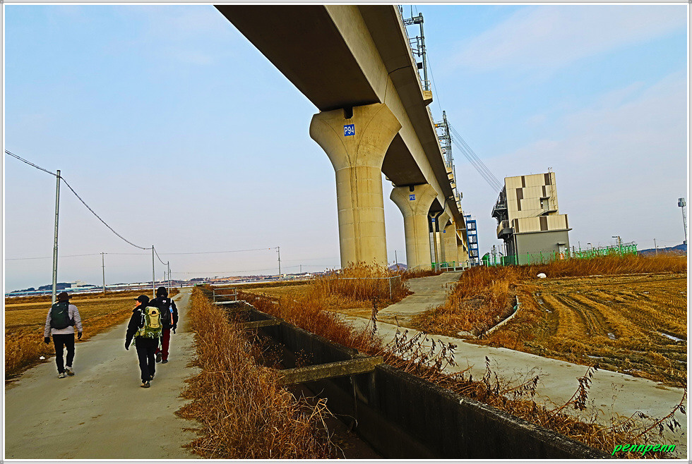 다시 서해선 철도 교각 밑을 통과합니다. 멀리 아산만 방조제가 보이지만 거리가 멀어 사진에 담기는 어렵습니다. 경기도 평택시 현덕변과 충남 아산시 인주면을 잇는 아산만방조제는 서해 아산만으로 흘러들며 충남(아산)과 경기(평택)의 경계를 이루는 안성천 하구에 축조된(1974년) 방조제입니다. 본래 축조 목적은 간척사업을 통해 농경지를 늘리고 홍수 및 염해 피해를 줄이는 것이었지만 경관이 아름다워 1977년 국민관광지로 지정되었습니다.