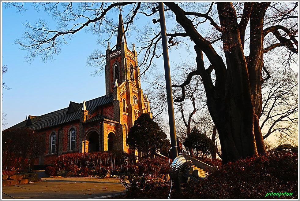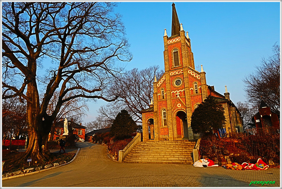 이제 공세리성당을 만날 차례입니다. 아산시 인주면 공세리 소재 공세리성당은 아산만 방조제 남쪽 공세리 언덕에 세워진 천주교 대전교구 소속의 본당으로 초기 선교사들이 포구에 상륙하여 전교를 시작한 곳으로 1894년 교회가 설립되었습니다. 사제관은 1897년, 본당은 1922년 완공되었습니다. 성당은 높은 첨탑을 지닌 고딕 양식의 붉은 벽돌이 그림 같아 2005년 한국관광공사 주관 대한민국을 대표하는 가장 아름다운 성당으로 선정된 곳입니다.