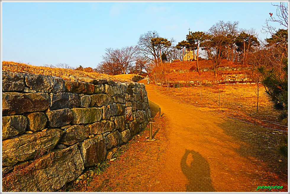 84코스의 출발지는 아산시 인주면 걸매리 인주공단교차로입니다. 그런데 코스를 약간 벗어난 곳에 위치한 아산 공세리성지(성당)를 좀 꼼꼼하게 둘러보기 위해 성당 진입로까지 약 3.5km는 등산버스를 타고 이동합니다. 진입로 입구 바로 옆에는 아산 공세곶고지와 삼도해운판관비가 있습니다. 아산시 인주면 공세리 소재 아산 공세곶고지는 조선전기 건축된 조세미 관련 창고터입니다. 조선 성종 9년(1478) 조창을 세워 처음에는 창고가 없이 노적하다가 중중 18년(1523) 비로소 창고 80칸을 건축하였으며, 현재 창고지(倉庫址) 주변에 축조한 성벽이 약 680m 정도 남아 있습니다.