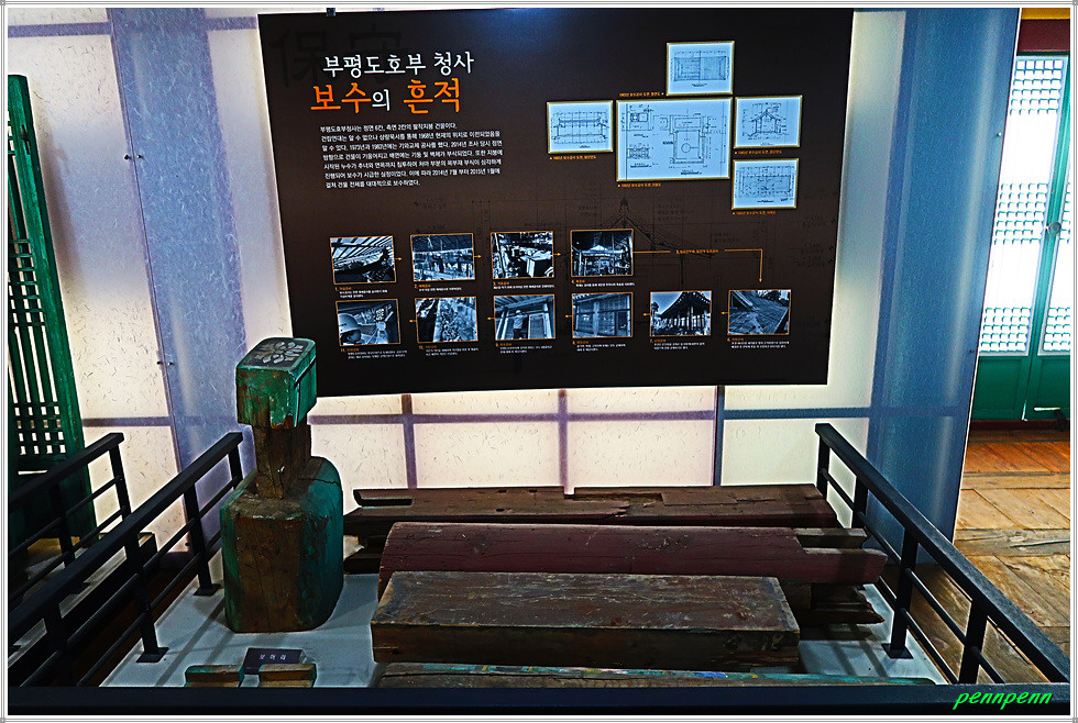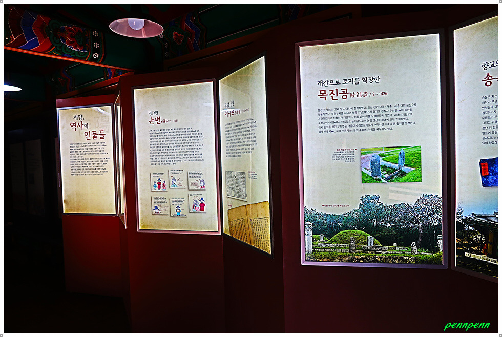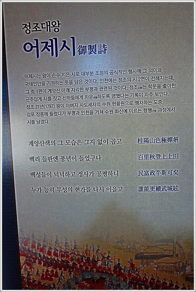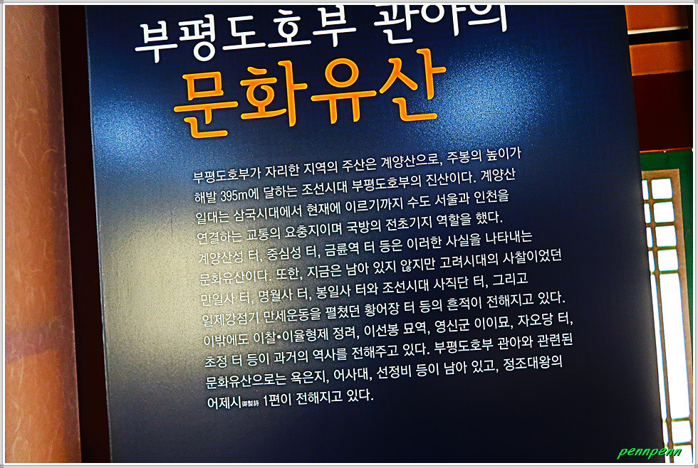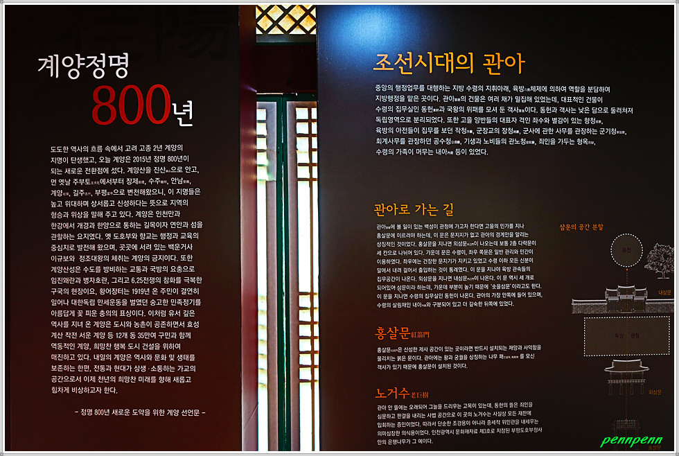 이제 관아(청사) 안으로 들어갑니다. 부평도호부의 옛 모습을 복원한 모형, 계양정명 800년(계양이라는 이름을 붙인지 800년 역사), 부평도호부사 선정비, 역사 속 계양의 인물들(이들 중 여진을 평정한 윤관, 문장의 대가인 이규보 선생은 기억에 남는 인물임), 어사대와 욕은지, 정조대왕이 지은 어제시(御製詩) 등 각종 자료를 일목요연하게 정리해 전시하고 있습니다.