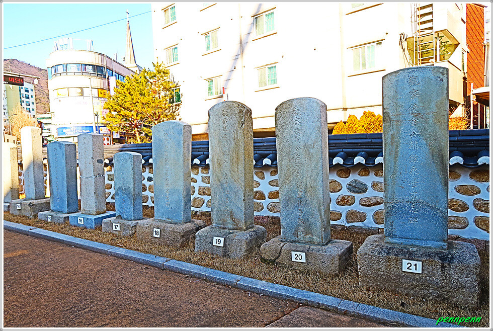 안쪽의 담벼락에는 21기의 부평도호부 부사 선정비가 세워져 있습니다. 이들은 인조 7년 (1629) 부평부사를 지냈던 오준(吳竣)의 선정비부터 고종 24년(1887) 부평부사였던 정병하(鄭秉夏)의 선정비까지 21기의 선정비가 남아 있습니다. 이 중 부평부사 선정비 18기, 경기도 관찰사의 공덕비가 3기입니다. 이들 비석군은 계양구 내에 있던 비석들을 한곳에 모아 이전한 것입니다. 담장 너머 부평초등학교 경내에는 수령 500년니 넘는 노거수 은행나무가 있는데 단풍이 들었을 때의 모습을 상상해 봅니다.