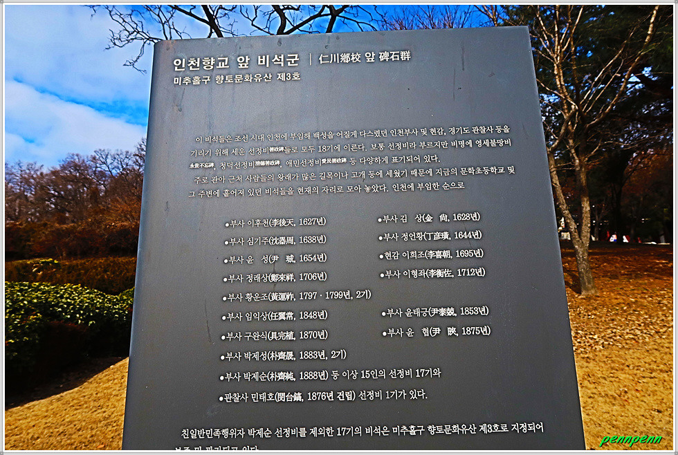 인천도호부관아 출입문을 들어서면 좌측에 홍살문이 보이는데 바로 인천향교 입구입니다. 그 좌측으로는 18기의 비석군이 일렬로 자리하고 있는데 이들 비석군은 조선시대 인천에 부임해 백성을 어질게 다스렸던 인천부사 및 현감, 경기도 관찰사 등을 기리기 위해 세운 18기의 선정비들입니다. 이 중 을사5적의 한명이었던 박제순(1858-1916)의 영세불망비는 그가 인천부사 겸 인천항감리로 재직(1888-1890)한 것을 기념해 세웠으나 친일청산 차원에서 철거했다가 현재 역사교육차원에서 눕혀 놓았다고 합니다.