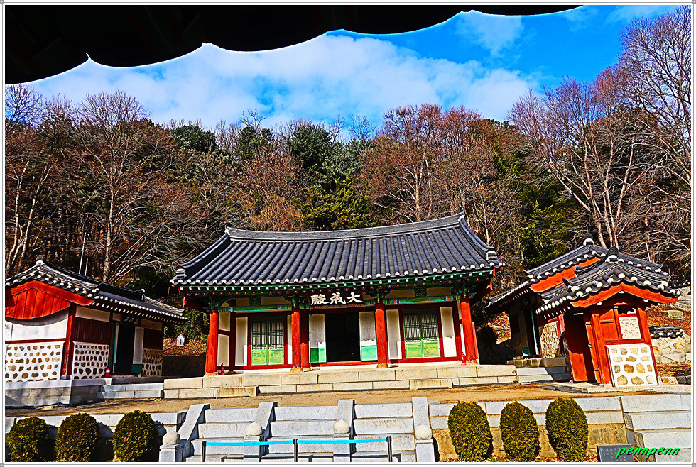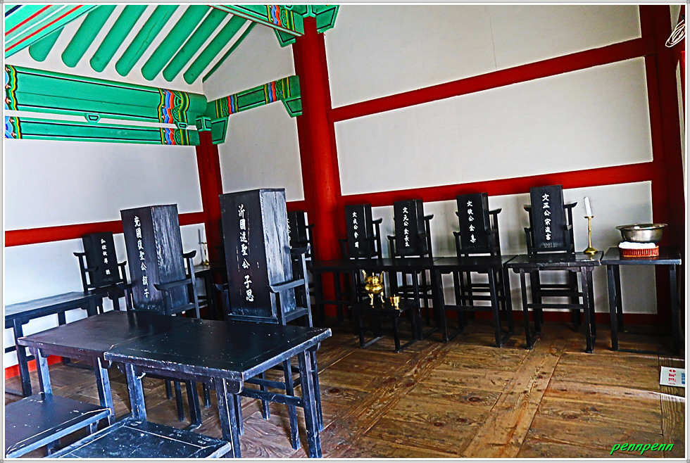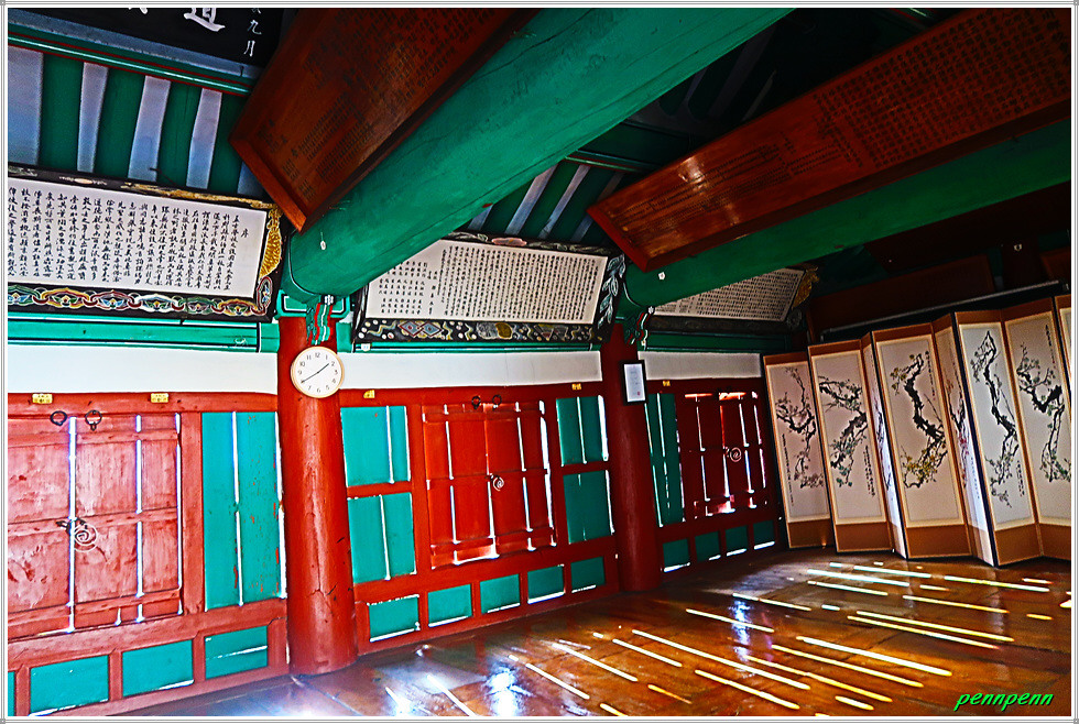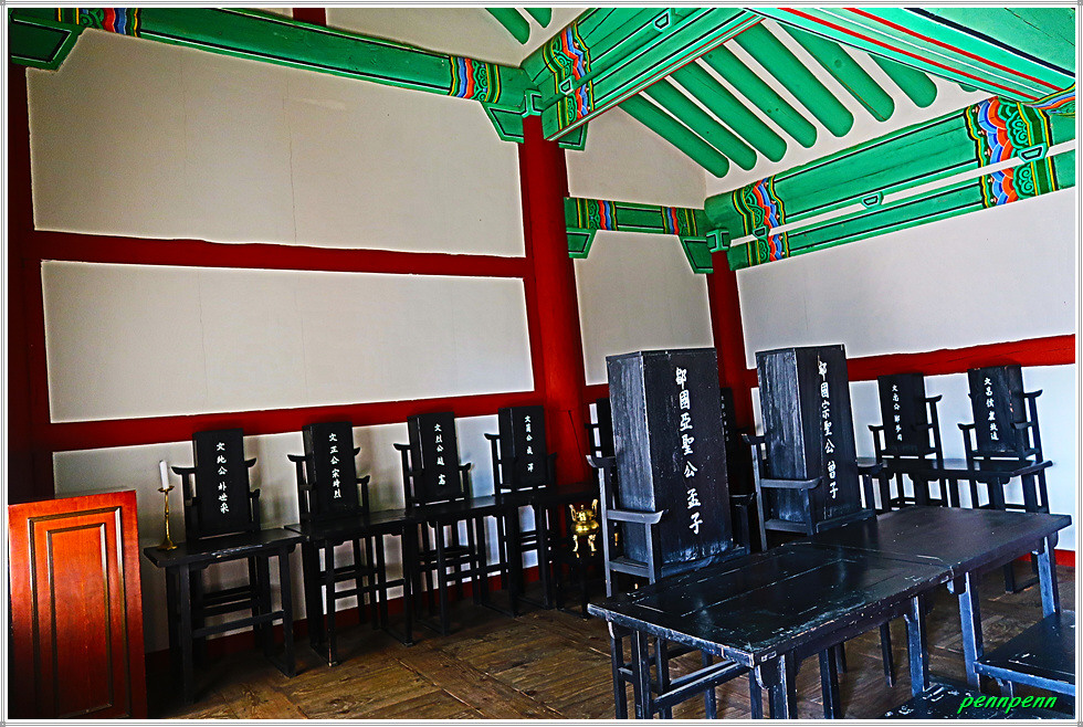 명륜당 뒤쪽에는 향교의 중심건물인 대성전(大成殿)입니다. 대성전은 공자를 위시한 중국의 성현들을 배향(학덕이 있는 사람의 신주를 문묘나 서원 따위에 모시는 일)하던 곳입니다. 대성전 앞 좌우에 있는 동무와 서무에는 한국의 성현을 배향하는데, 이곳에는 최치원 등 역대 유생이 배향되었습니다. 그런데 1949년 전국유림대회의 결의에 따라 각 향교의 동무와 서무에 모셔져 있던 위패들을 모두 대성전으로 옮겼답니다.