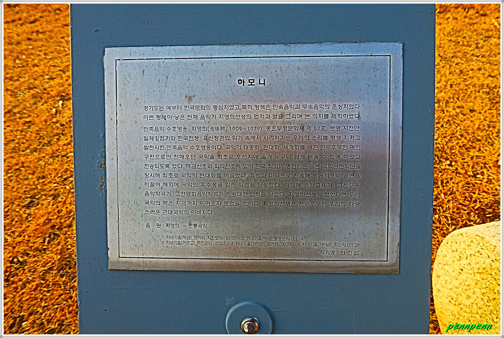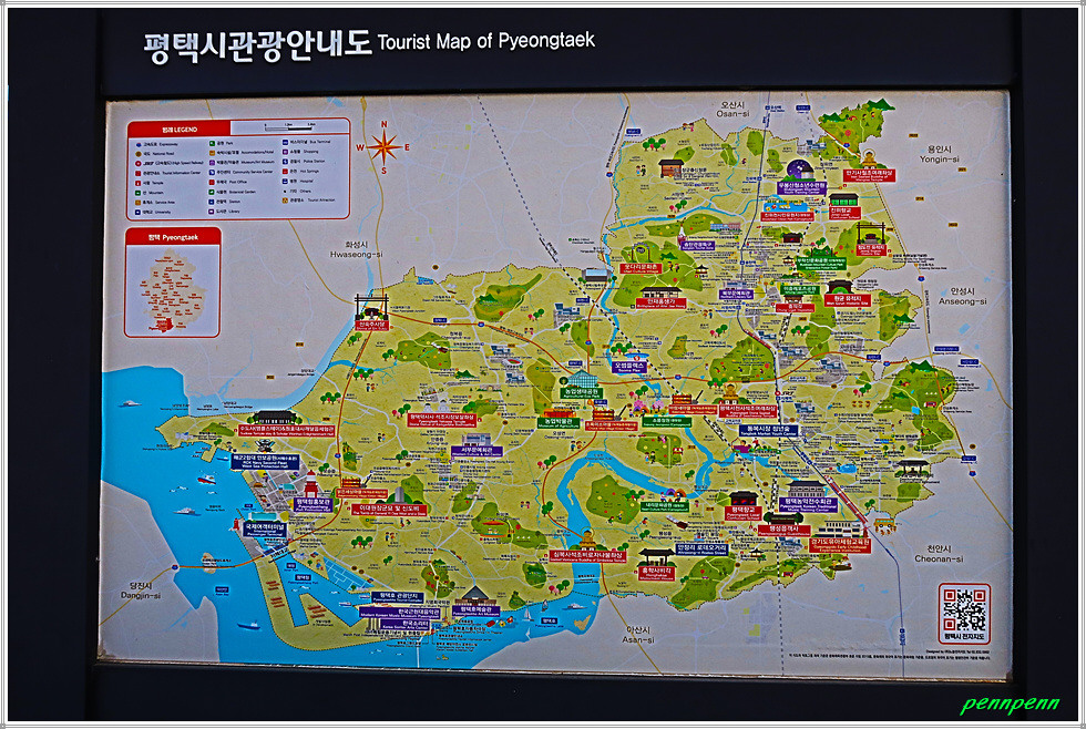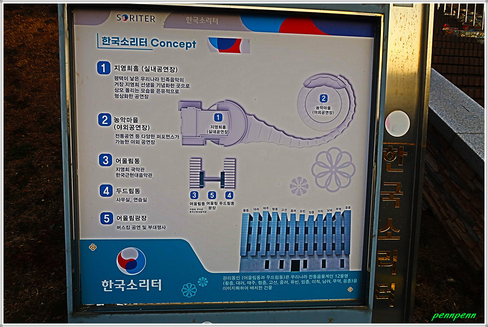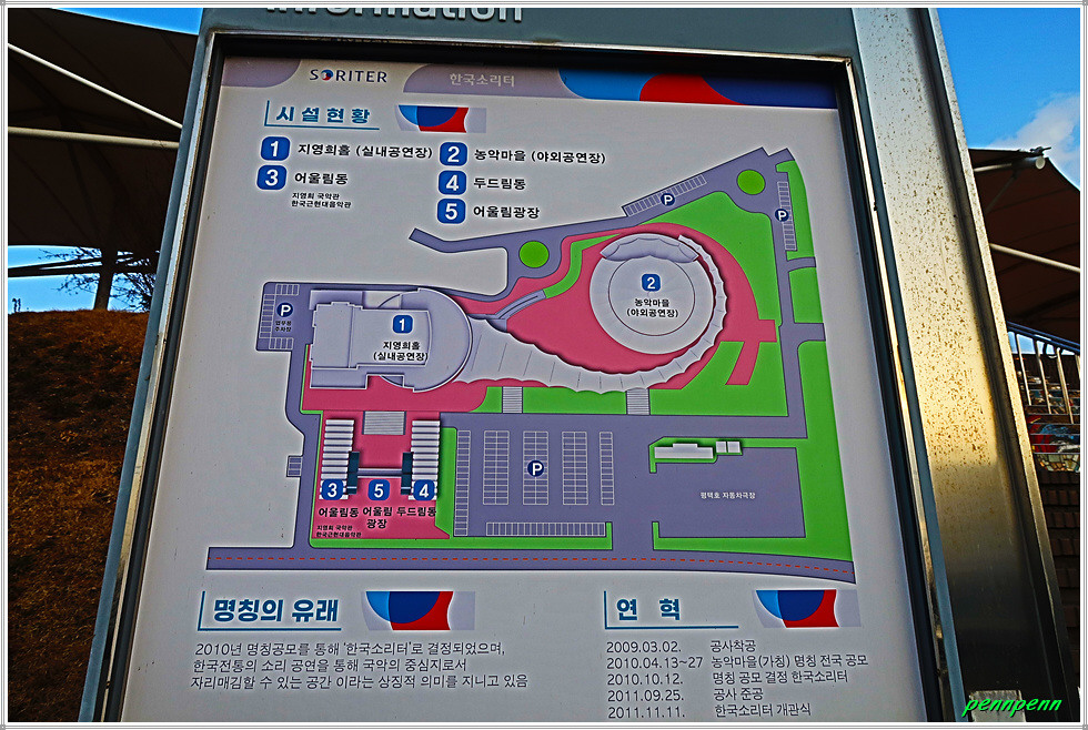 한국소리터 주차장에 도착해 주변을 둘러봅니다. 한국소리터는 평택 호반을 한눈에 조망할 수 있는 관광 휴양공간인 평택호 예술공원에 조성된 복합문화공간으로 다채로운 한국전통의 소리공연을 통해 한국국악의 중심지라는 상징적의미를 지닌 곳입니다. 이곳에는 평택 출신의 국악거장 지영희 선생을 기념하는 지영희홀(577석), 야외공연장(약 300석), 어울림광장 등으로 나뉘어져 있습니다. 주차장에는 평택관광안내도와 평택8경 관련 자료가 게시되어 있습니다.