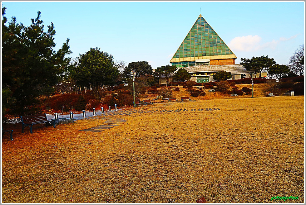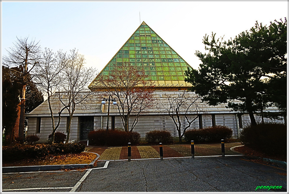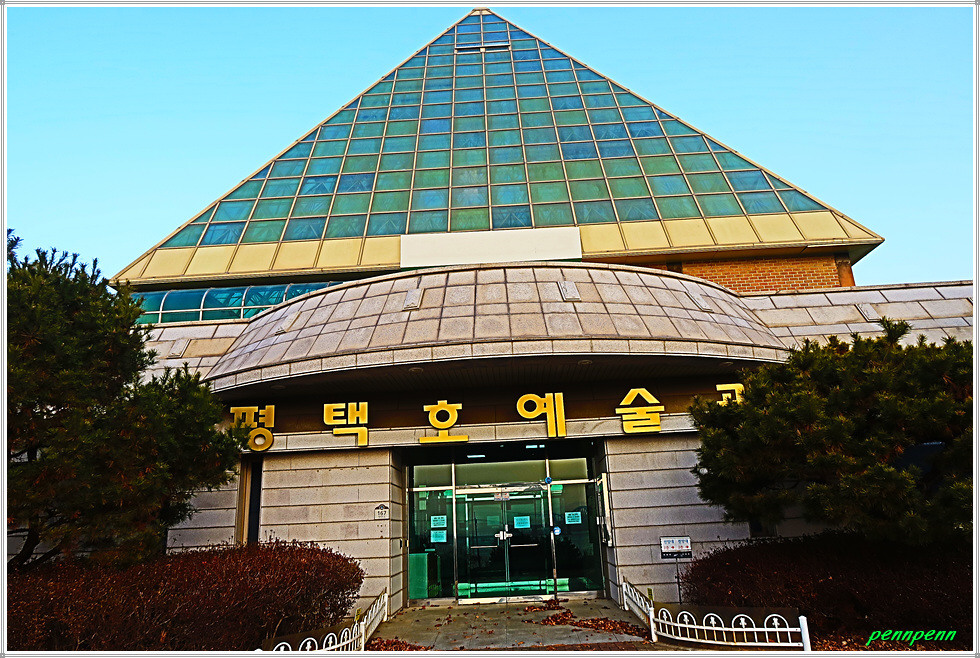 주차장에서 계단을 오르면 좌측에 원형의 실내공연장인 지영희홀이 있고 우측에는 야외공연장인 농악마을이 있습니다. 그 우측 삼각형 모양의 지붕이 보이는 건축물은 평택호예술관입니다. 평택호예술관은 평택호예술공원 내 전시관 겸 다목적홀로 개관한 문화예술 공간입니다. 이곳은 지역 문화예술인들의 예술 작품을 전시하고 소규모 공연과 행사를 개최하는 곳입니다. 1층은 장방형, 2층과 3층은 유리로 마감한 피라미드형으로 설계돼 조형미가 독특한 건물로 멀리서도 눈에 잘 뜨입니다.
