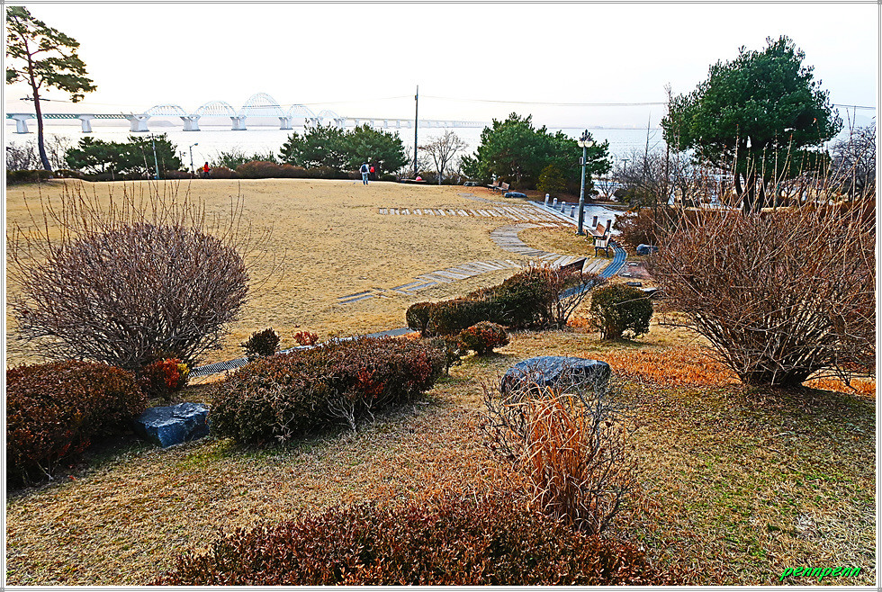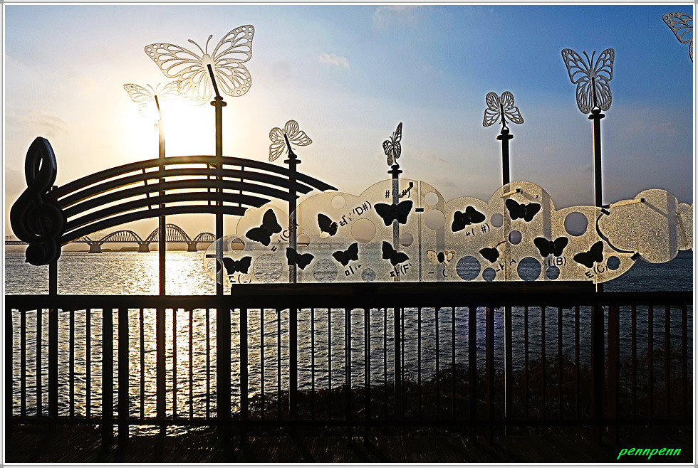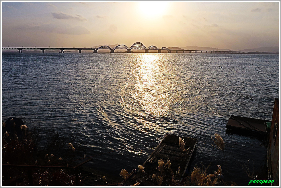 이곳에서 바라보는 평택호(아산호)를 남북으로 가로지르는 서해선철도 고가교와 태양빛이 반사된 모습이 비록 일몰이 아름답다고는 하지만 일출후의 오전 모습도 매우 멋집니다.