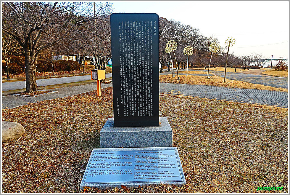 예술관 주변 야외공원에는 각종 예술작품들이 전시되어 있습니다. 이 중에서도 백미는 아마도 세상에서 가장 큰 호미일 듯합니다. 평택호반의 일명 모래톱공원에는 혜초선생 기념비가 세워져 있습니다. 혜초(704-787)는 통일신라시대의 승려로 중국 당나라로 건너가 천축 출신 승려 금강지의 제자가 되어 밀교(密敎)를 연구하였으며 인도와 중앙아시아를 포함한 서역 지역을 여행한 그는 왕오천축국전이라는 기행문을 남긴 인물입니다.