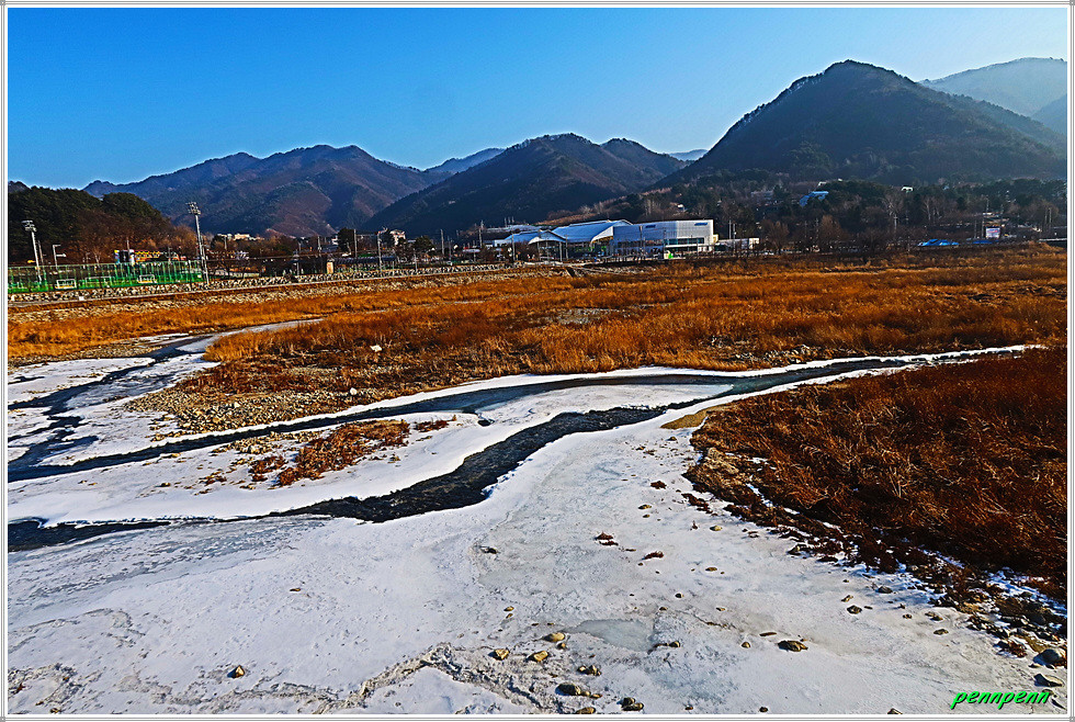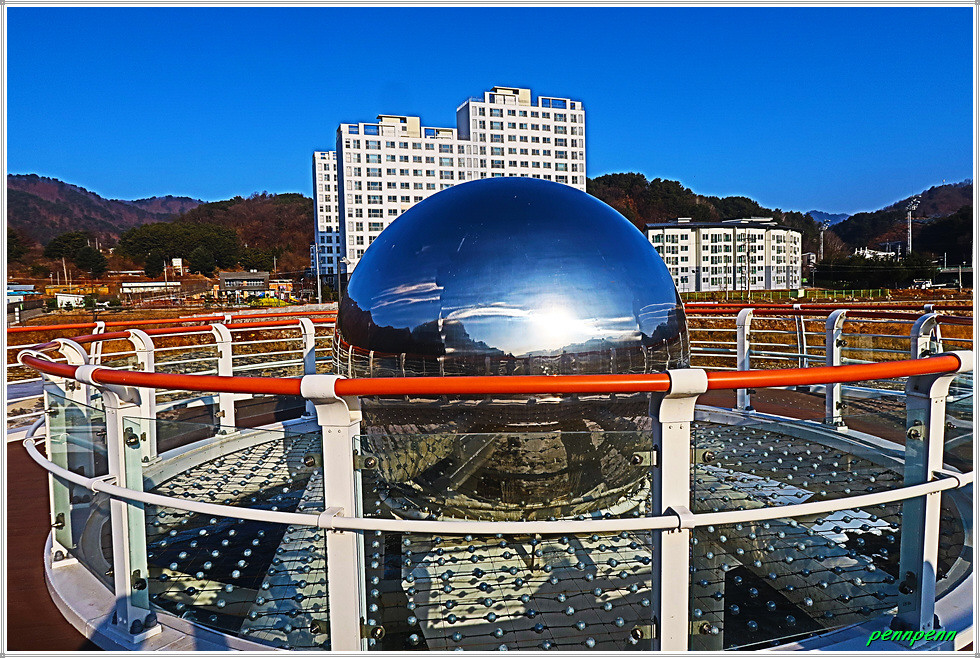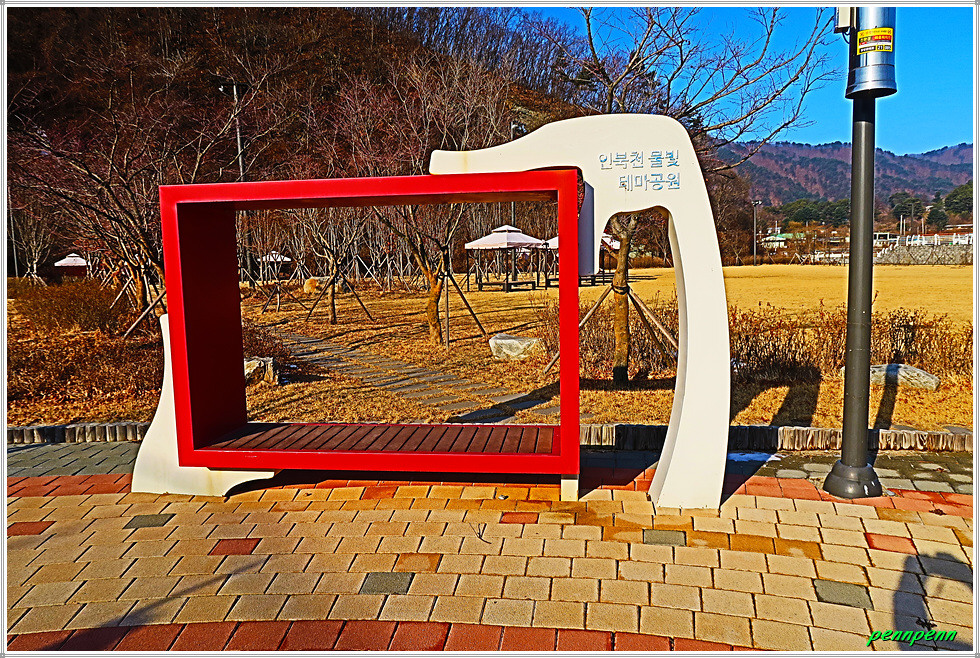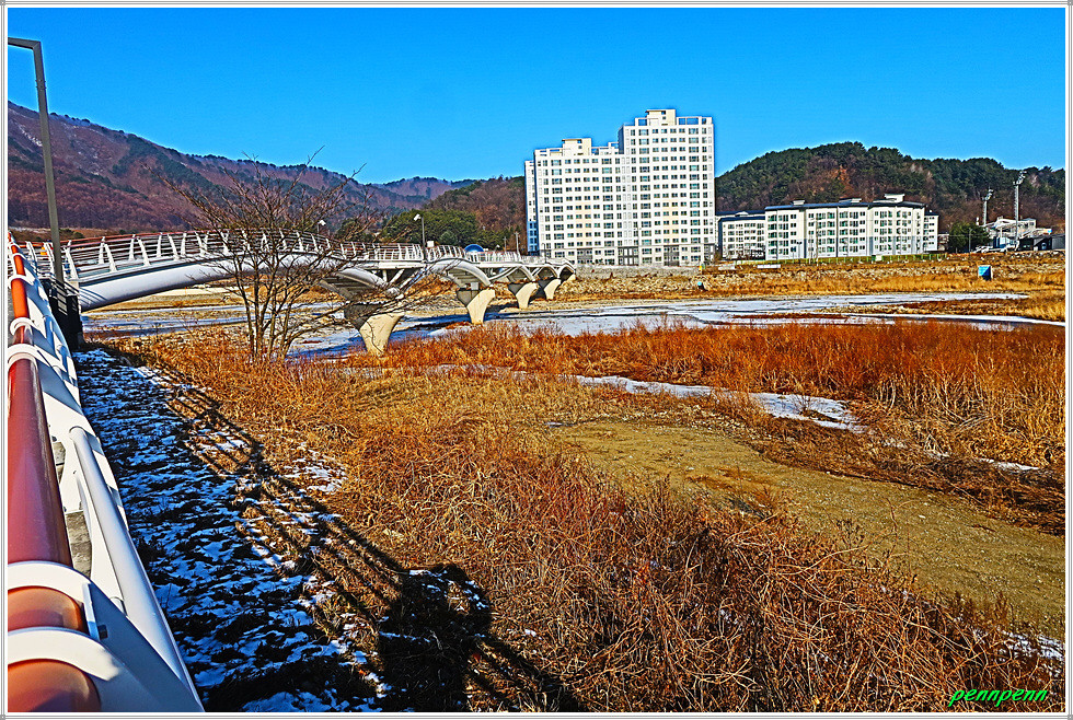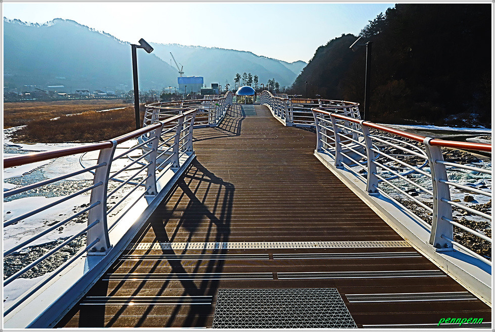이 전용보행교의 이름은 종합안내도에는 그냥 "보도교"로 표기되어 있지만 인터넷으로 검색한 결과 “물결보도교”로 부른 이가 있어 좋은 이름으로 생각합니다. 교량에서 바라보는 인북천은 한겨울 강추위에 꽁꽁 얼어붙었군요. 교량의 중간에 마치 구슬 같은 영롱한 조형물이 있는데 현지에 안내문이 없어 잘 모르겠지만 인북천물빛테마공원 진입교량에 있는 것으로 봐서 이 조형물은 물방울을 형상화한 것으로 보여집니다.