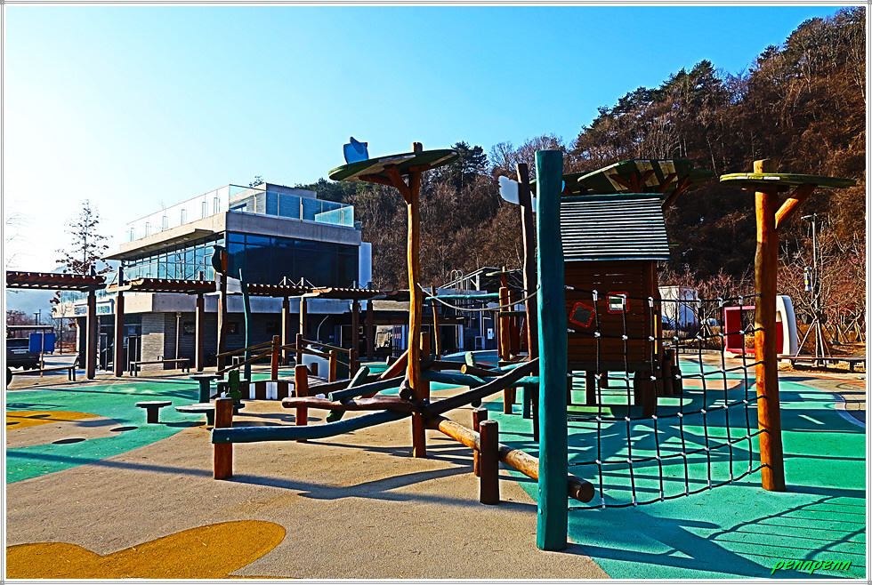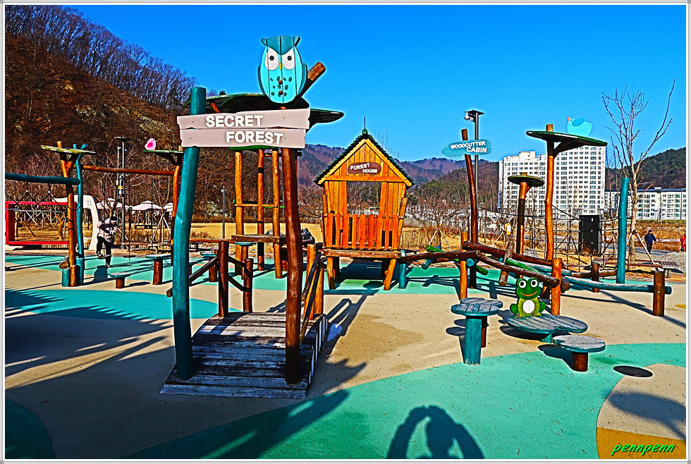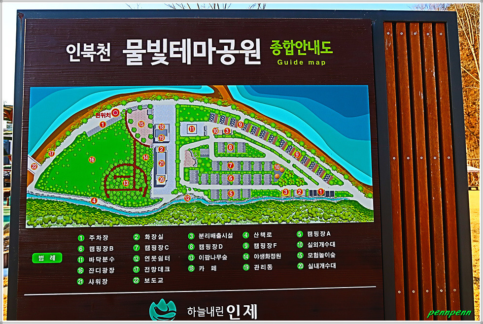 물결보도교를 건너면 인북천물빛테마공원입니다. 인제군 소화면 천도리 소재 인북천물빛테마공원은 도시의 소음에서 벗어나 맑은 공기와 초록의 풍경이 어우러진 곳, 사계절 내내 자연을 느끼며 쉴 수 있는 프라이빗 힐링 공간. 넓은 부지 곳곳에 분수, 수목, 정원, 공원, 놀이터 등 다양한 테마의 자연 공간이 조화를 이루고 있습니다. 이곳에는 캠핑과 카라반 사이트, 편의점, 감성카페, 수영장, 어린이놀이터, 바닥분수, 개인화장실과 샤워실 등의 각종 편의시설이 있어 휴식을 취하는데 불편함이 없는 곳입니다.