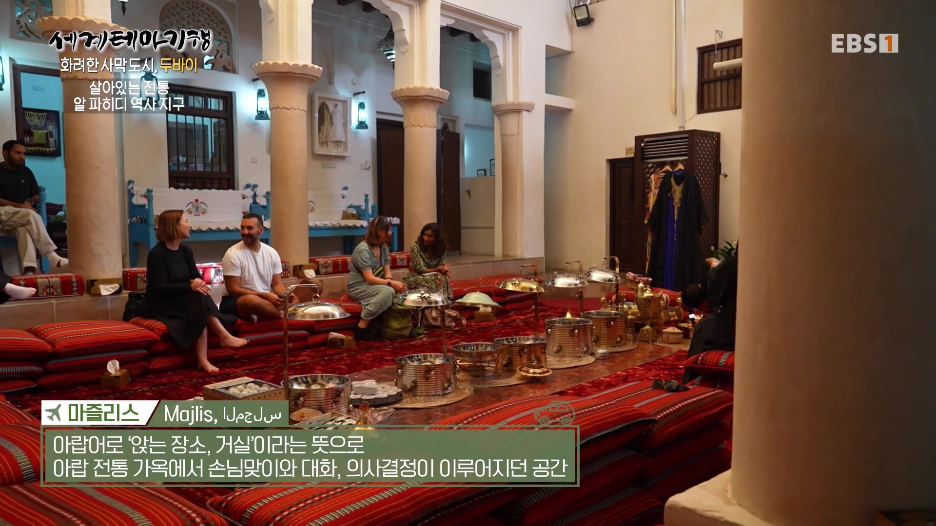 두바이는 연방국인 아랍 에미리트를 구성하는 7개의 토호국 중 하나로 가장 큰 도시입니다. 알 파히디 역사지구는 18-19세기 건설된 요새로 전통가옥이 모여 있는 주거지역입니다. 바람탑은 찬 공기는 아래로 더운 공기는 위로 올리는 대류원리를 이용한 일종의 공기순환탑입니다. 마즐리스는 거실이라는 뜻으로 아랍전통가옥에서 손님맞이가 이루어지던 공간입니다. 이곳은 방문객에게 차를 대접하면서 대화를 나누는 장소입니다. 이 나라 인구의 10%는 원주민이고 90%는 이방인이라고 합니다. 전통가옥 내부를 식당으로 개조한 맛집으로 가서 두바이가정식 요리를 주문합니다.