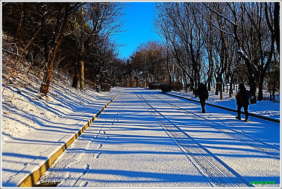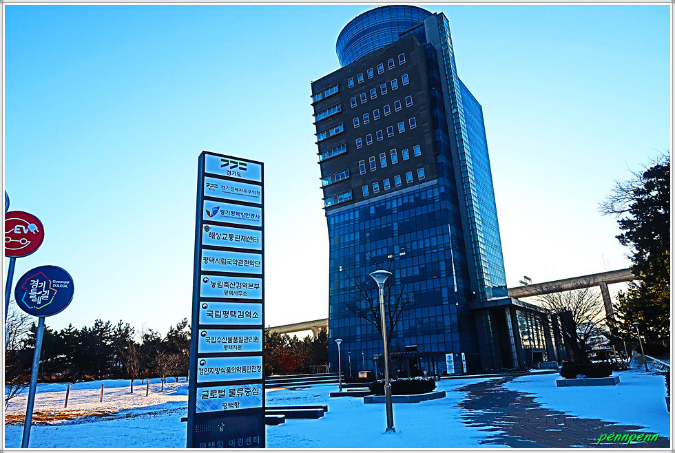 86코스의 출발지는 평택시 포승읍 만호리 평택항의 평택항마린센터 앞입니다. 이곳에는 서해랑길 86코스 안내지도와 QR인증코드가 있습니다. 그런데 거리를 조금(약 1.5km) 단축하는 대신 평택항 홍보관과 수도사를 좀 더 꼼꼼하게 살펴보기 위해 B팀(노약자)은 등산버스를 타고 평택항 홍보관입구까지 이동합니다. 홍보관으로 오르는 진입도로는 밤새 내린 눈이 하얗게 쌓여 있군요.