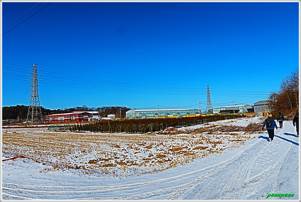 원종초등학교 우측으로 진입해 지구촌 교회를 보며 걷습니다. 밤새 내린 눈으로 인해 길이 상당히 미끄러워 발걸음이 매우 조심스럽습니다. 77번 국도(포승향남로)를 만나 좌측으로 조금 가다가 수원국도관리사무소 자재창고에서 좌측으로 방향을 돌립니다. 야산의 숲으로 진입해 철조망이 있는 좁은 길을 통과하니 발아래 수도사가 보입니다.