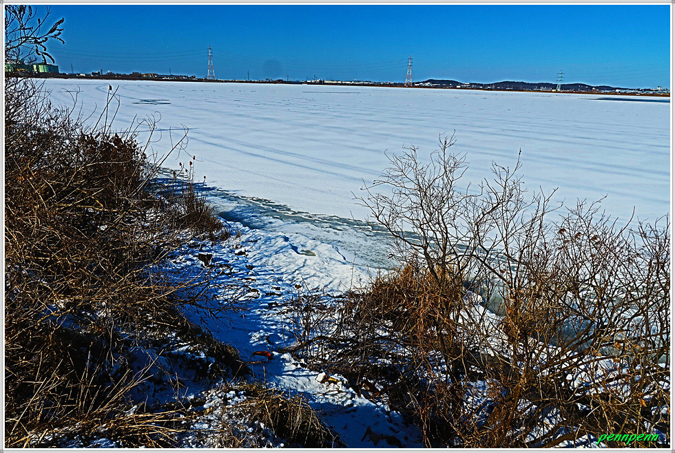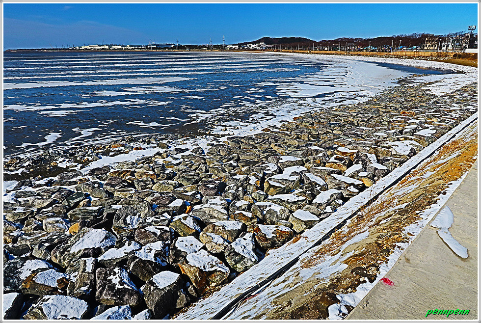 남양방조제의 중간지점인 평택시와 화성시의 경계를 지나갑니다. 배수갑문을 통과하면 화성특례시에서 환영인사를 하네요. 화성 쪽으로 점점 다가갈수록 방조제바깥 쪽의 바다는 꽁꽁 언 모습입니다. 비록 수위가 낮다고는 하지만 염분이 있는 바닷물이 이처럼 꽁꽁 얼어붙은 모습은 정말 특이합니다.