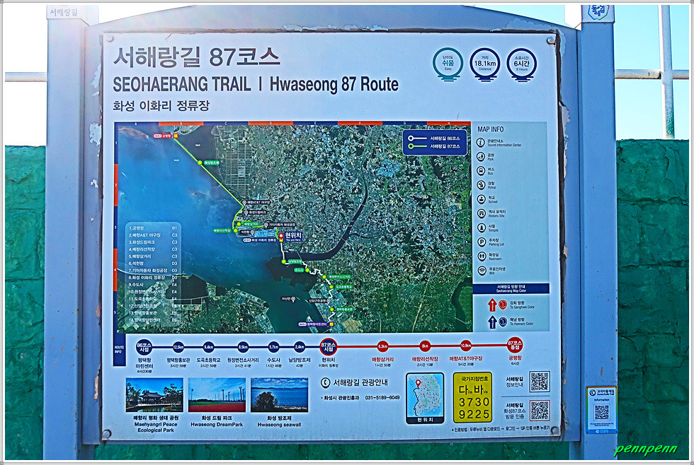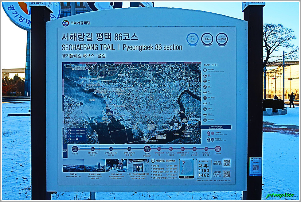 방조제가 끝나는 기아자동차 사거리에 서해랑길 87코스 안내지도가 있습니다. 사거리에는 이화5리 버스정류장이 보입니다. 오늘 13.3km를 걷는데 4시간이 소요되었습니다. 오늘 낮 기온은 영하5도에서 영하 1도였지만 체감온도는 영하 9도에서 7도였습니다. 그러나 예보보다 바람이 약해 그리 춥지는 않았고 하늘도 맑게 개어 매우 청명했습니다. 이제 평택구간(2개 코스)이 끝나고 다음부터는 화성구간(3개 코스)으로 이어집니다.