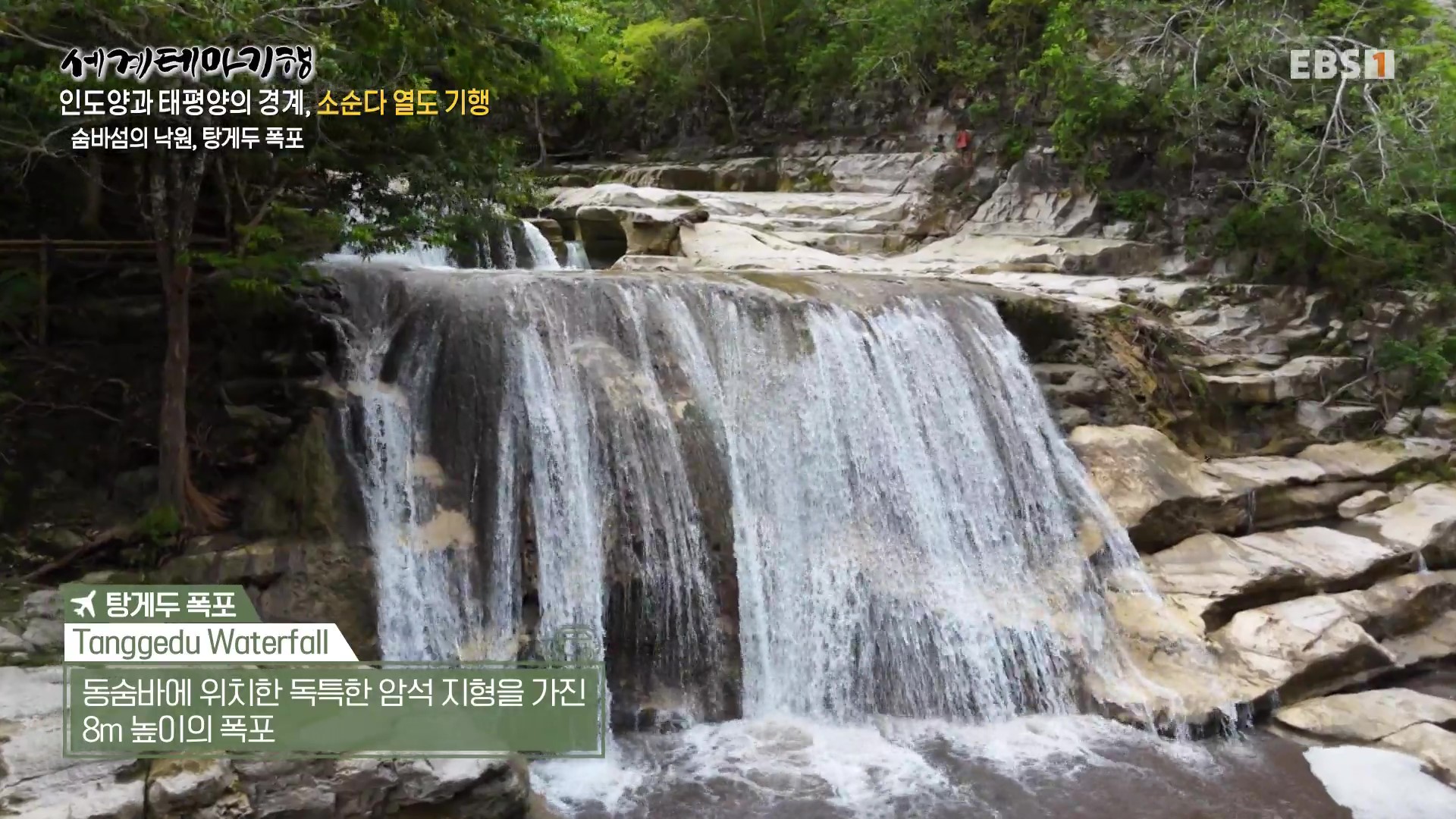 탕게두 폭포(높이 8m)가 있는 지역은 화산섬이 아니라 바다가 융기해서 생긴 섬이어서 지형이 몽글몽글한 구릉지대를 형성하고 있습니다. 그런데 계단식으로 형성된 탕게두 폭포는 우기여서 그런지 아래쪽은 온통 흙탕물이지만 위로 올라갈수록 맑은 물이 흐립니다.