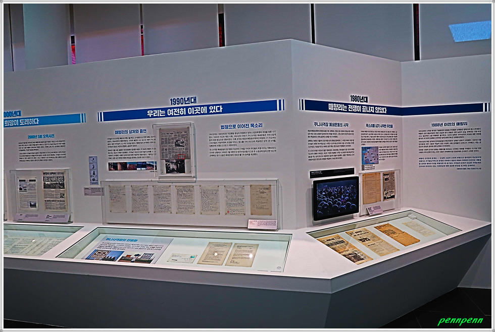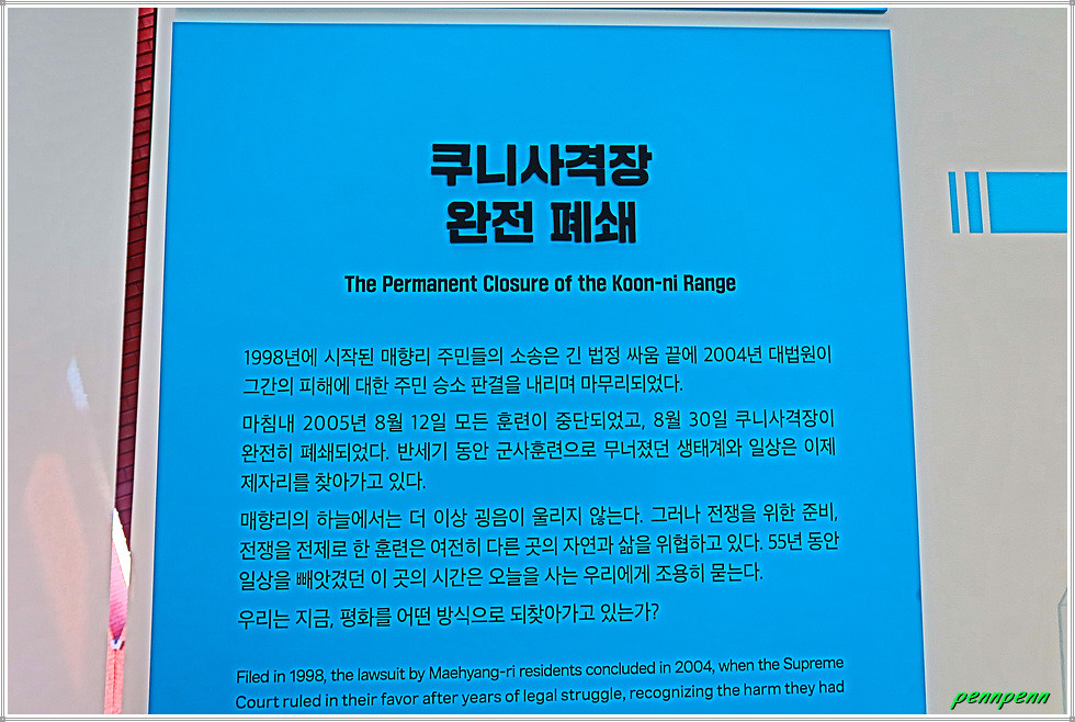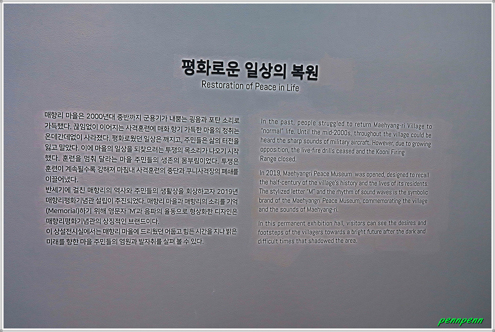 위병소 오른쪽에 위치한 매향리 역사기념관으로 들어섭니다. 2층으로 오르면 상설전시실입니다. 이곳은 매향리가 평화를 되찾기까지의 과정을 조명하고 그 속에 담긴 가치를 되새겨 볼 수 있는 공간입니다. 쿠니사격장의 설치부터 폐쇄에 이르기까지 매향리에서 일어난 아픔의 시간들과 평화를 되찾기 위한 주민들의 노력을 담고 있습니다. 참고로 쿠니사격장의 쿠니라는 명칭은 매향리의 옛 이름인 고온리에서 유래했습니다. 미군이 이 지명을 영어로 “KOON-NI"로 표기하여 쿠니라고 부른 게 그 출발점이랍니다.