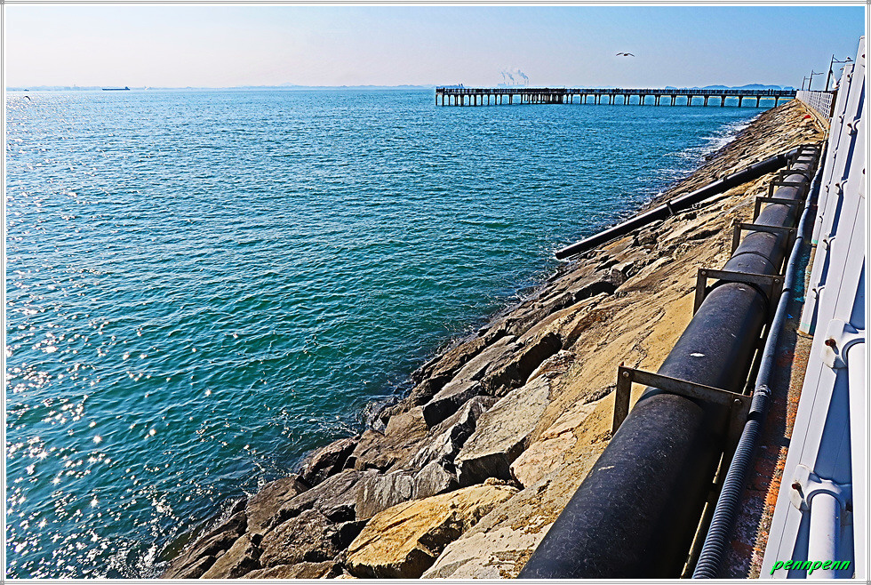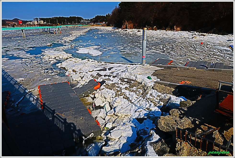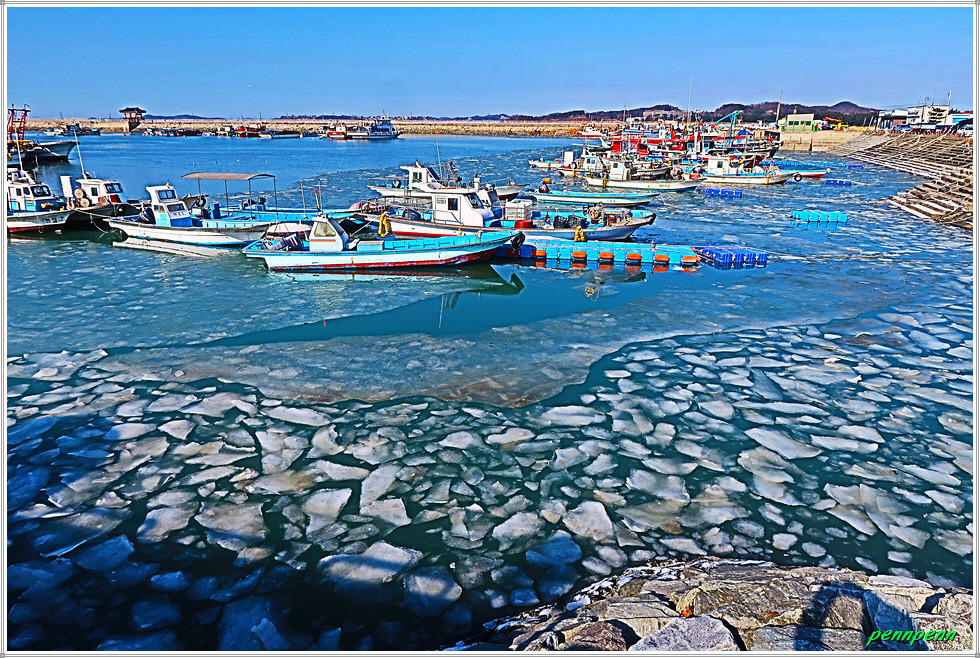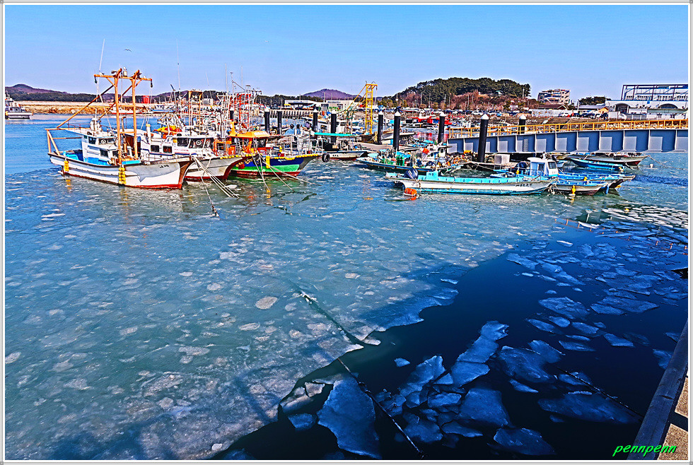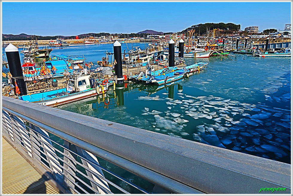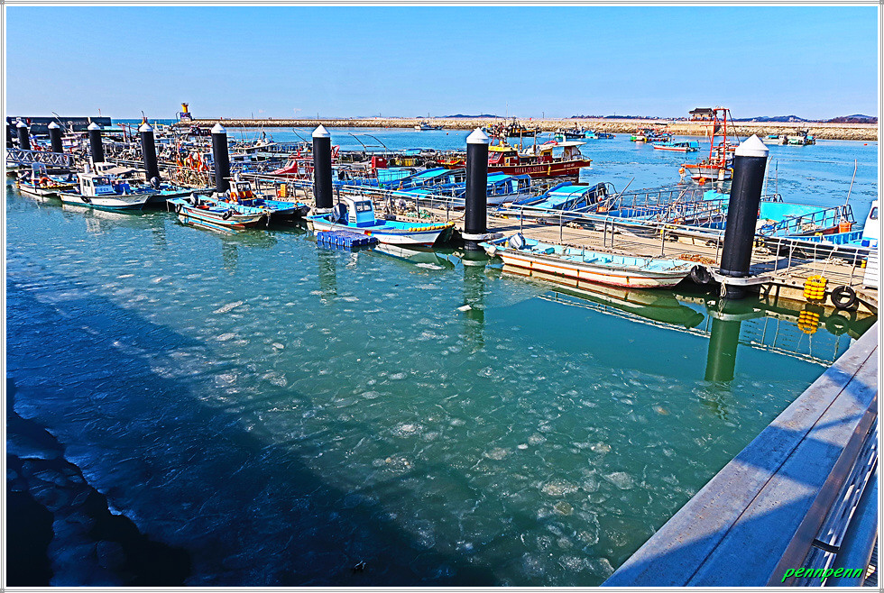 궁평항 선착장에는 많은 어선들이 방파제 안에 정박해 있는데 바다는 최근의 매서운 혹한으로 인해 꽁꽁 얼어붙어 있어 선박들은 마치 겨울잠을 자는 모습 같습니다. 궁평항은 길이가 9.8km에 달하는 화성방조제 북단에 자리 잡고 있어 궁평항 방파제에서 배수갑문(우정교)이 잘 보입니다. 궁평항 선착장 끝머리에는 낚시꾼들을 위해 피싱피어(fishing pier)가 조성되어 있군요. 부두에 올라온 선박에도 갈매기 여러 마리가 옹기종기 앉아 있습니다.