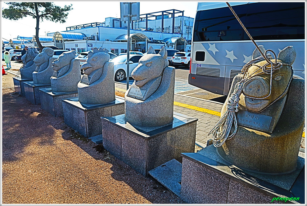 궁평항 광장으로 나오면 어린이 놀이터, 명품 젓갈과 게장 직판장이 있으며 주변에는 음식점이 다수 보입니다. 광장 한쪽에는 화성특례시 관광안내지도가 세워져 있군요. 주차장에는 십이간지의 동물형상 석상이 보입니다.