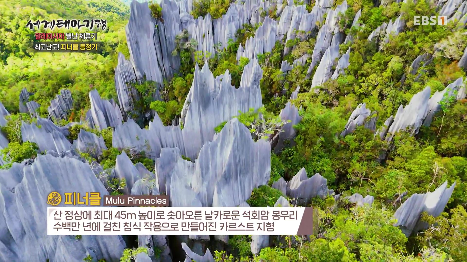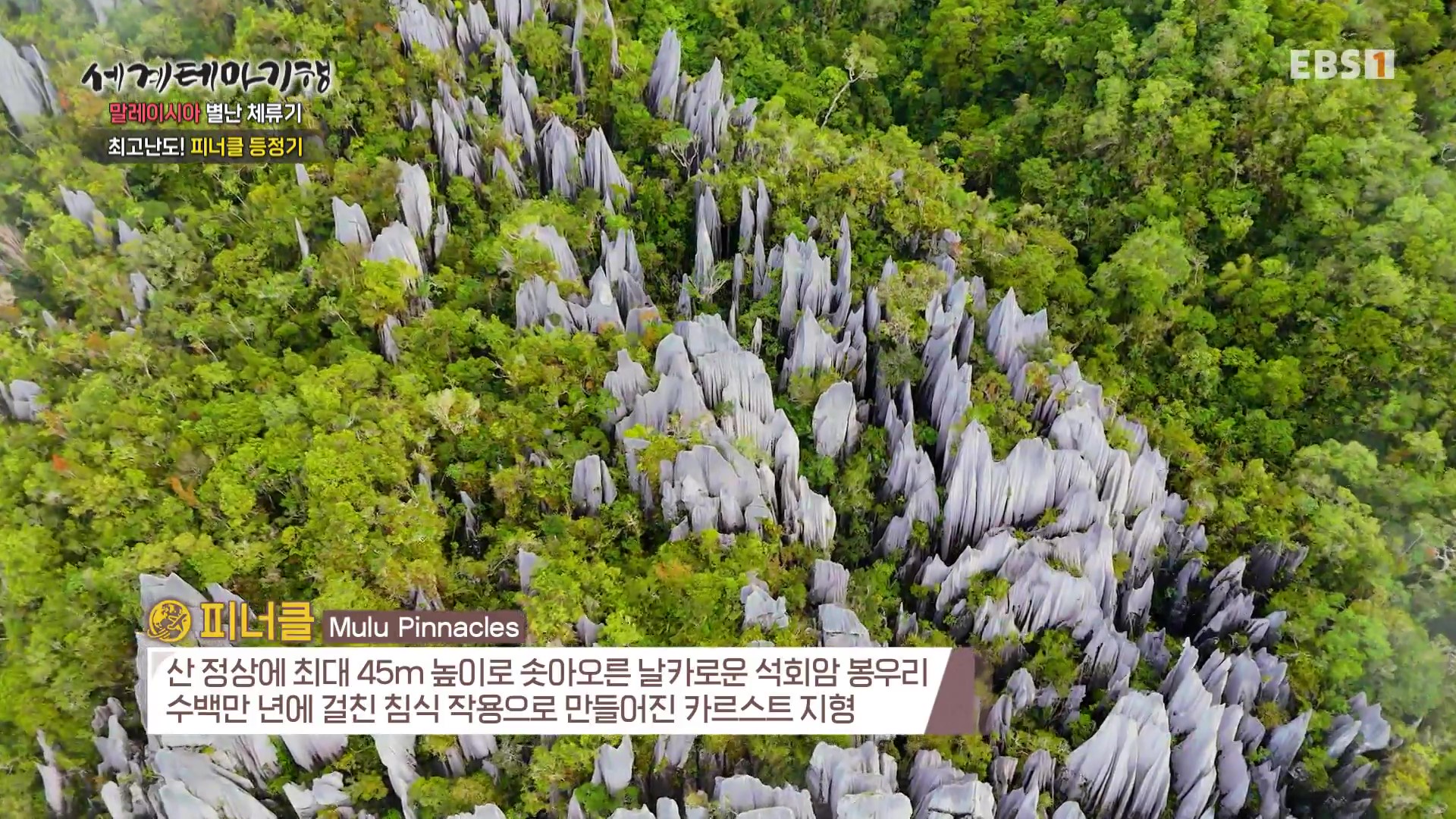 눈앞에 펼쳐지는 환상적인 풍경에 그간의 피로가 눈 녹듯 살아집니다. 정상에는 최대 높이 50m의 석회암 봉우리가 만든 카르스트지형이 장관입니다. 열대우림의 장대비가 수 백 만년 동안 조각한 자연의 걸작입니다.