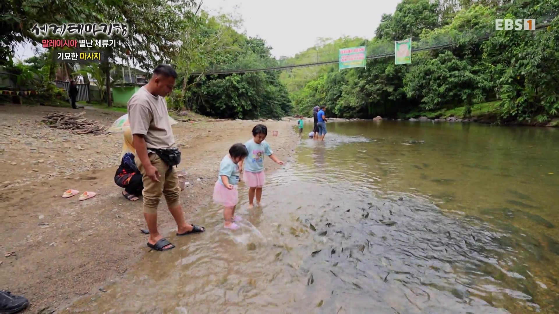 이제는 동남아의 최고봉인 코타키나발루산(4,095m)으로 갑니다. 사람들은 산의 계곡에서 물놀이를 즐기고 있습니다. 먼저 물고기로 마사지를 하는 곳으로 갑니다. 계곡에 물고기가 바글바글한 곳에 사람이 들어가면 물고기가 사람에게 달려들어 물고기 부리로 피부를 건드리는데 꼭 마사지하는 것 같습니다. 참으로 신기한 체험이로군요.