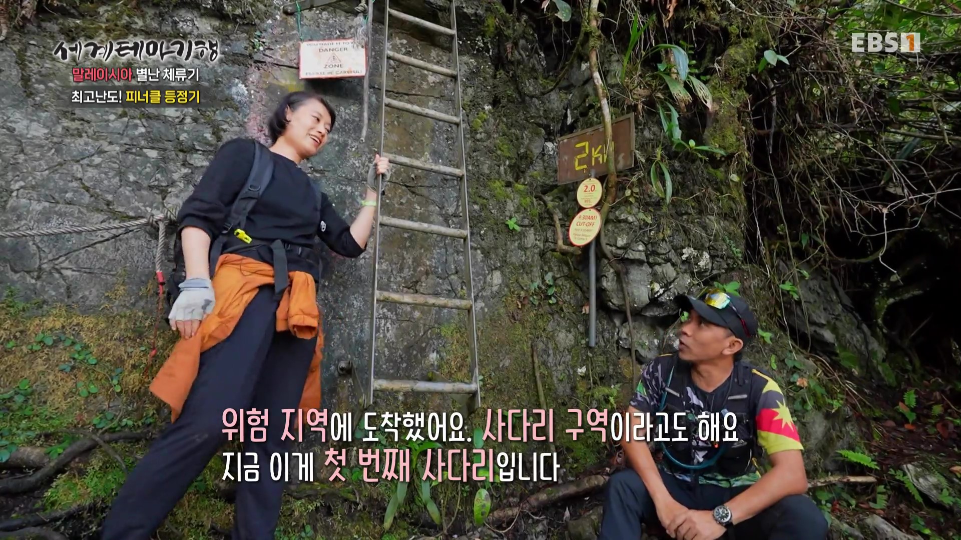 이곳에서 물루산 정상까지는 2.4km로 길이 매우 험합니다. 45도의 기울기로 약 1,100m를 올라야하는 고난도 등산로입니다. 이곳은 열대우림의 석회암지역이라서 빗물이 석회암을 녹여 뾰족한 바위로 변한 것입니다. 일단 첫 번째 구간은 성공했습니다. 두 번째 구간은 우회로이지만 밧줄이 없이는 불가능한 길입니다. 사다리 위험구간에서 17개의 사다리를 올라야 정상인데 앞이 캄캄하군요. 우여곡절 끝에 드디어 정상입니다.