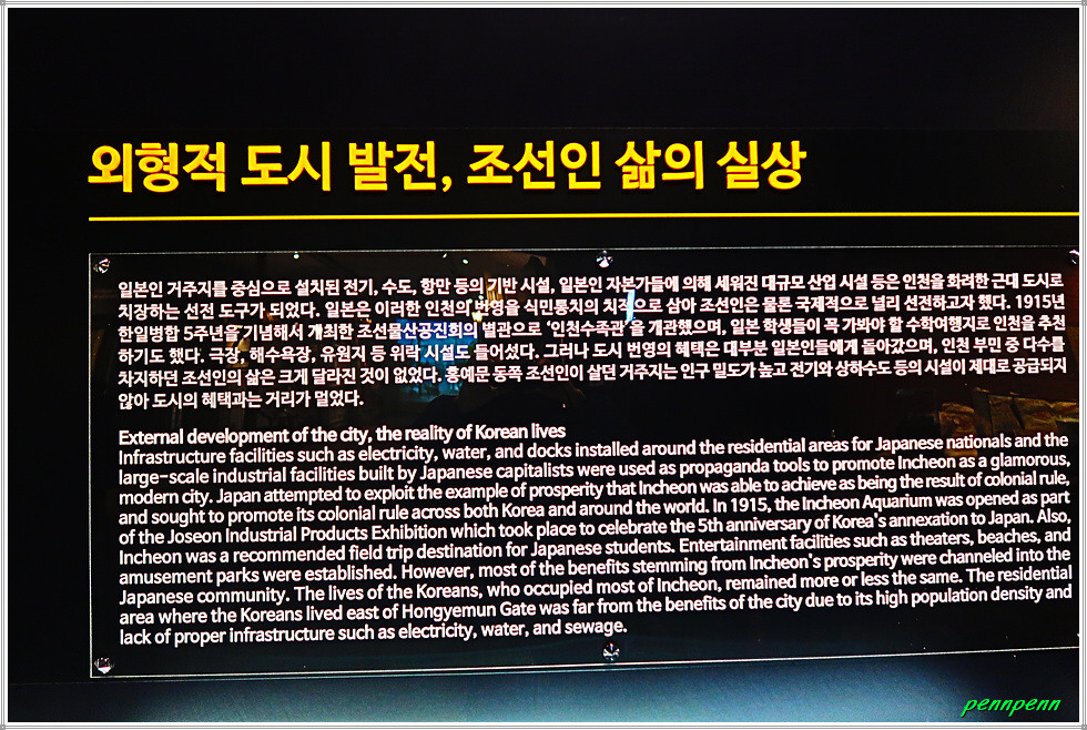 일본인 거주지를 중심으로 설치된 전기, 수도, 항만 등 기반시설과 일본인 자본가들에 의해 세워진 대규모 산업시설은 인천을 화려한 근대도시로 치장하는 선전도구가 되었습니다. 1915년 한일합방 5주년을 기념해 개최한 조선물산공진회의 별관에 인천수족관을 개관해 일본학생들에게 수학여행지로 인천을 추천하기도 했습니다. 도시의 발전은 극장, 해수욕장, 유유원지 등 인천부민을 위한 위락시설도 들어섰지만 이러한 혜택은 대부분 일본인들에게 돌아갔습니다.