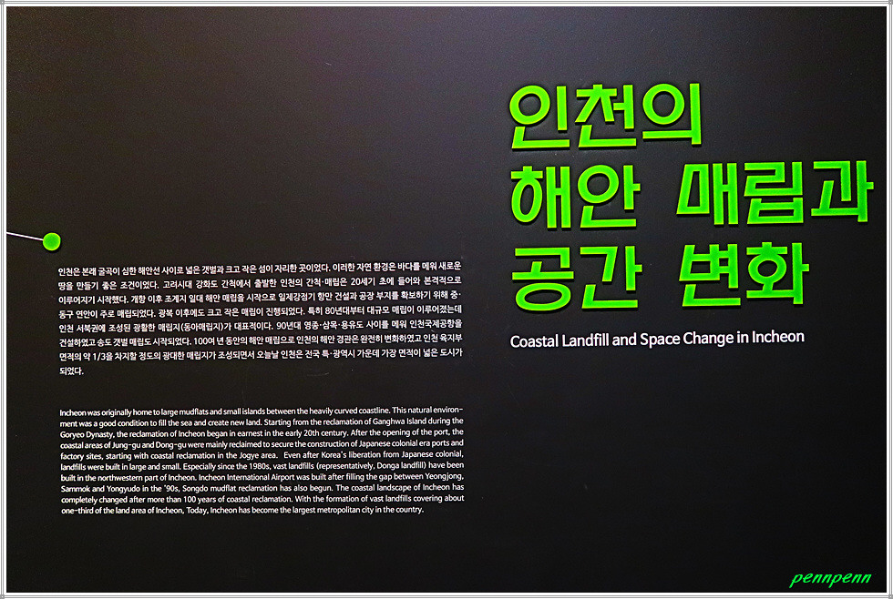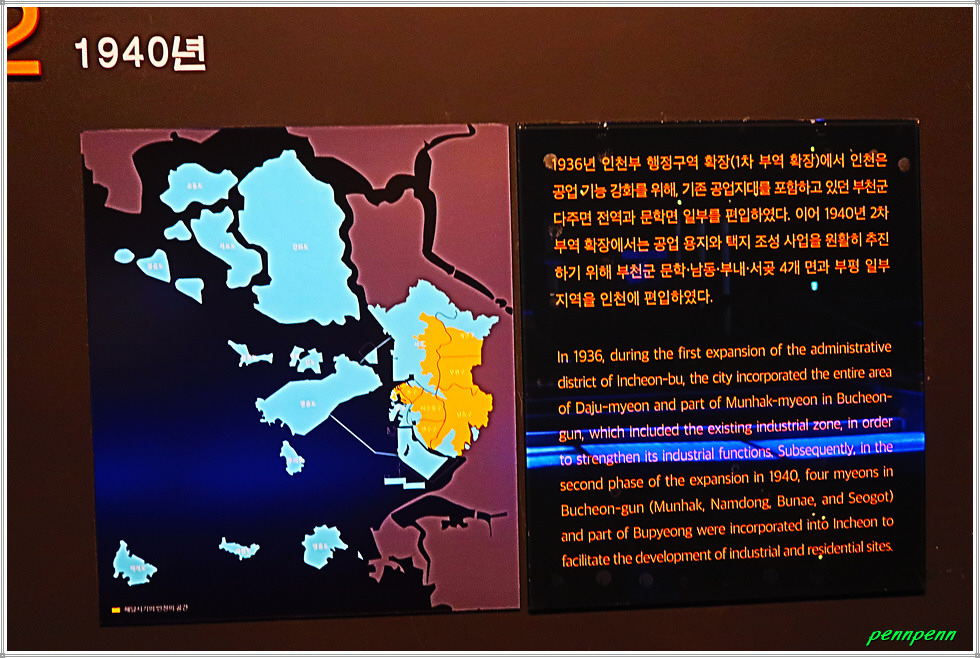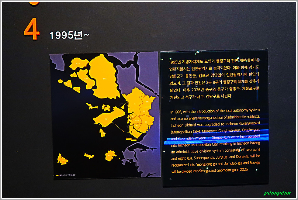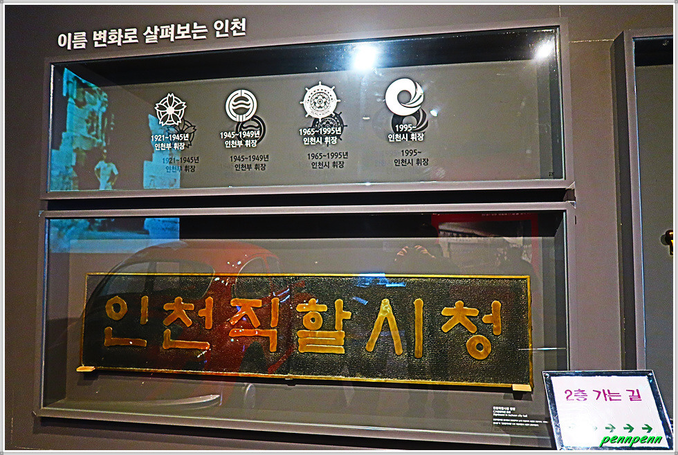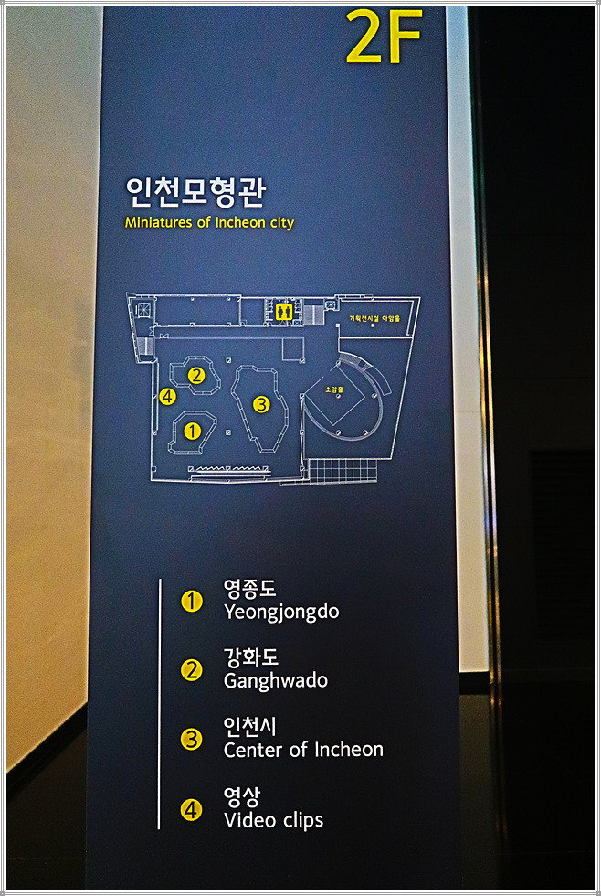 2층으로 오르면 상설전시관인 인천모형관입니다. 이곳에는 영종도와 강화도 및 인천시의 모형을 만들어 전시하고 있습니다. 인천은 일제강점기를 거치며 점차 구역이 확대되었는데, 1989년 김포군 계양면과 옹진군 영종.용유면이 편입되었고, 1995년 전국적인 행정개편으로 김포군 검단면과 강화군.옹진군이 통합되면서 인천의 영역이 크게 확대되었습니다.