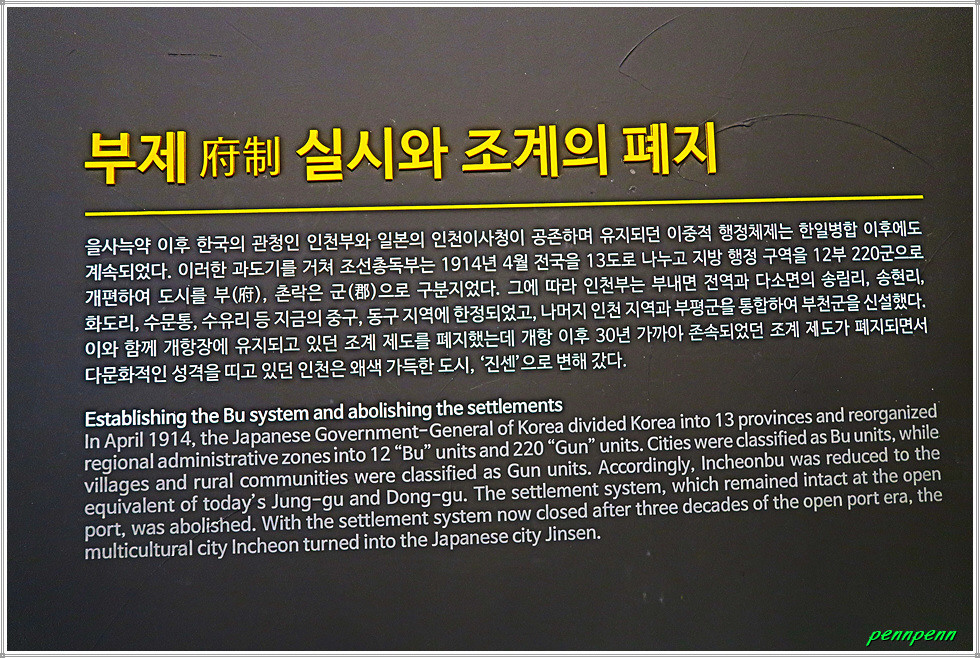 을사늑약이후 한국관청 인천부와 일본 관청 인천이사청이 공존하며 유지되던 이중적 행정체제는 한일한방 이후에도 계속되었습니다. 과도기를 거친 후 1914년 조선총독부는 전국을 13도(道), 지방을 12부(府) 220군(郡)으로 개편했습니다. 이에 따라 인천에도 인천부와 부평군이 생겼으며 개항장 조계제도를 폐지했습니다. 이로 인해 인천은 다문화적인 성격에서 왜색이 짙은 도시 진센(인천의 일본식 발음)으로 변해 갔습니다.