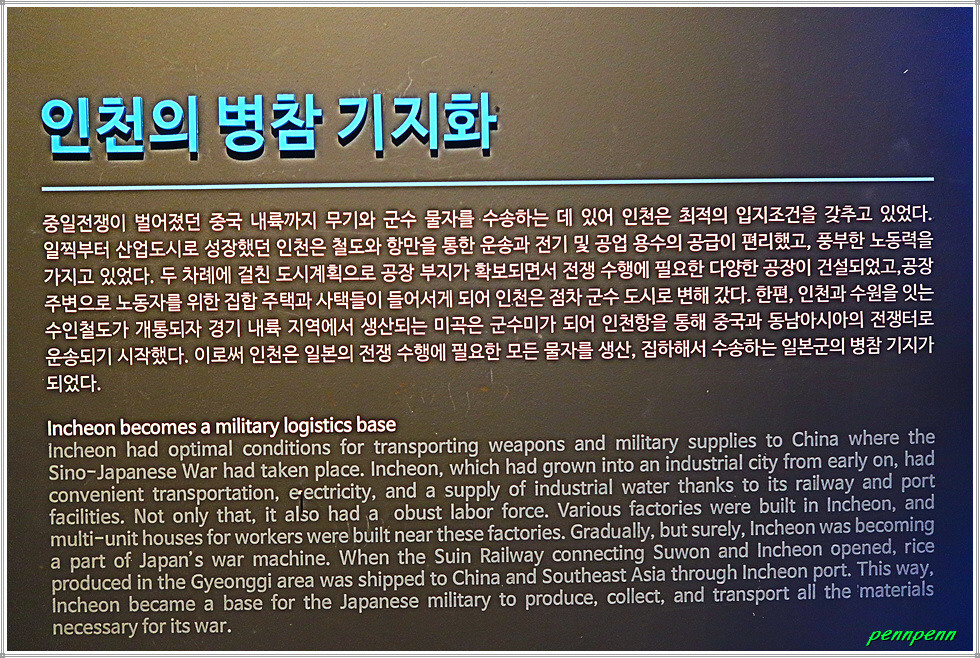 중일전쟁이 벌어졌던 중국내륙까지 무기와 군수물자 수송에 있소 인천은 최적의 입지조건을 갖추고 있었습니다. 인천은 철도와 항만을 통한 운송과 전기 및 공업용수의 공급이 편리했고, 풍부한 노동력을 갖고 있었습니다. 또한 인천에는 전쟁수행에 필요한 다양한 군수공장이 건설되고, 수원과 인천을 잇는 수인철도 개통으로 경기내륙에서 생산된 미곡이 군수미가 되어 인천항을 통해 중국과 동남아의 전쟁터로 운송되기 시작해 인천은 일본군의 병참기지가 되었습니다.