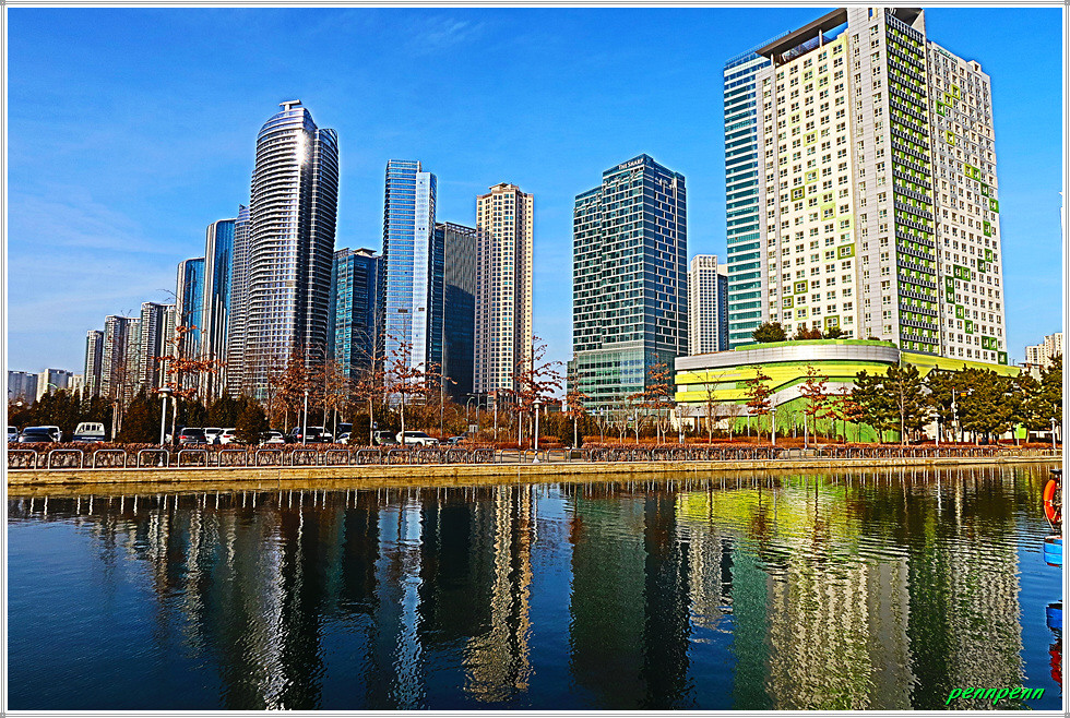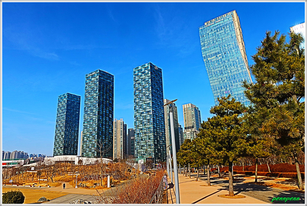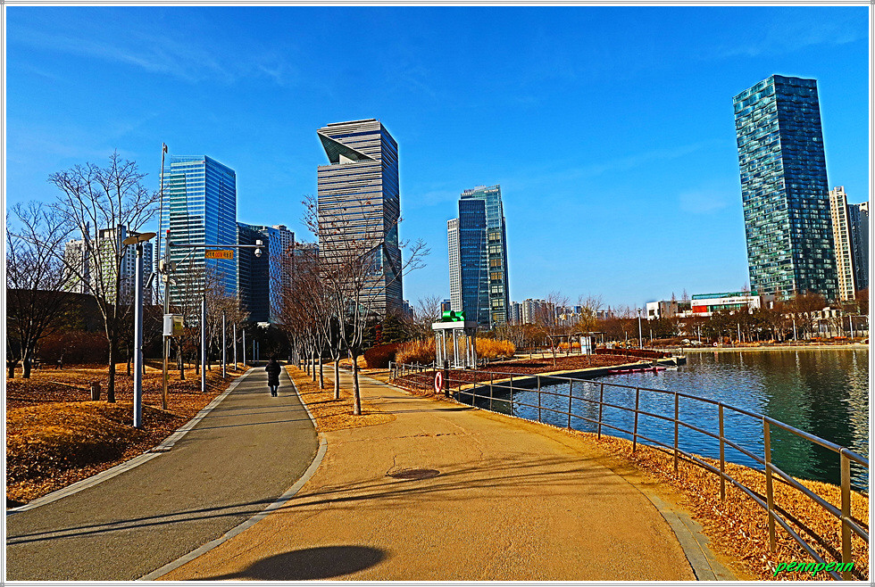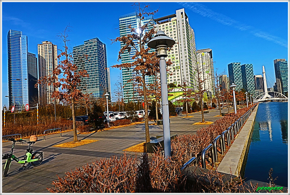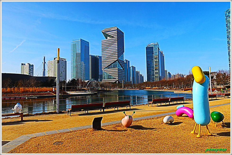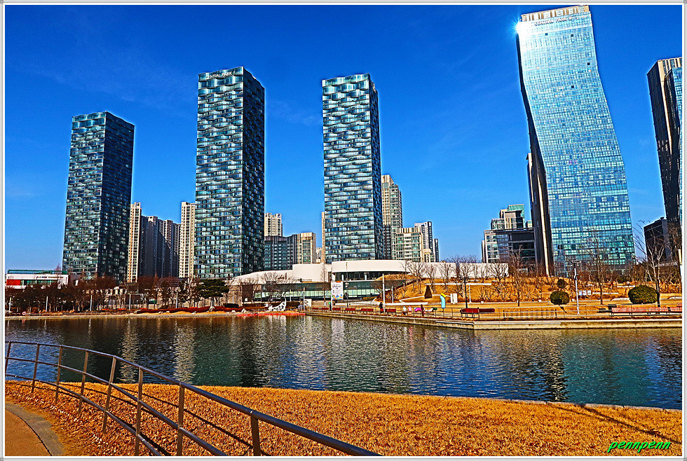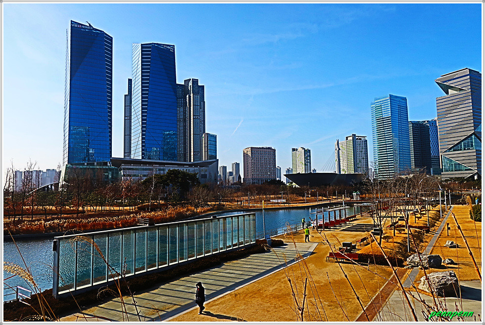 여기서 지나온 인공호수 주변의 건축물을 뒤돌아보는 풍경도 멋집니다. 송도국제도시가 조성될 때부터 이곳을 중동의 두바이라고 불렀습니다. 이곳 센트럴파크주변에 늘어선 첨단 건축물들이 춤추는 듯한 모습을 보노라면 이곳이 과연 한국이 맞는지 의아스러울 지경입니다.