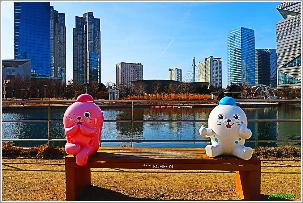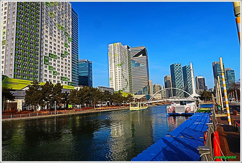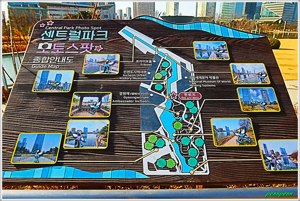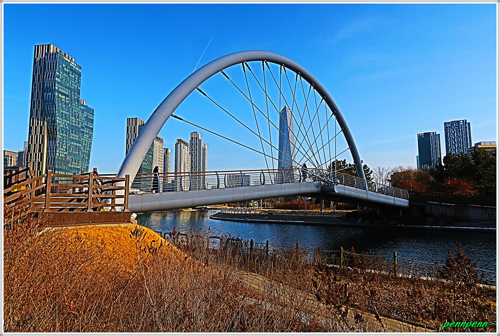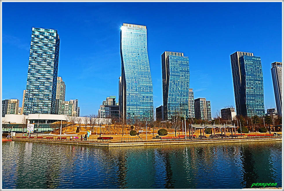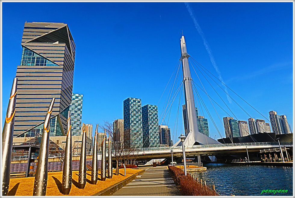 여기서 지나온 인공호수 주변의 건축물을 뒤돌아보는 풍경도 멋집니다. 송도국제도시가 조성될 때부터 이곳을 중동의 두바이라고 불렀습니다. 이곳 센트럴파크주변에 늘어선 첨단 건축물들이 춤추는 듯한 모습을 보노라면 이곳이 과연 한국이 맞는지 의아스러울 지경입니다.