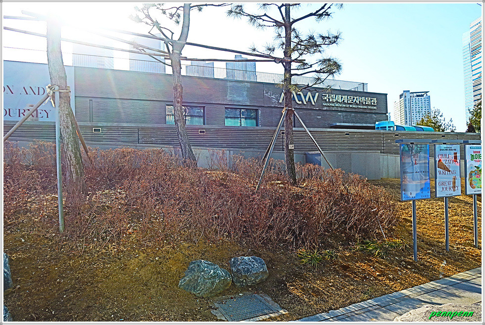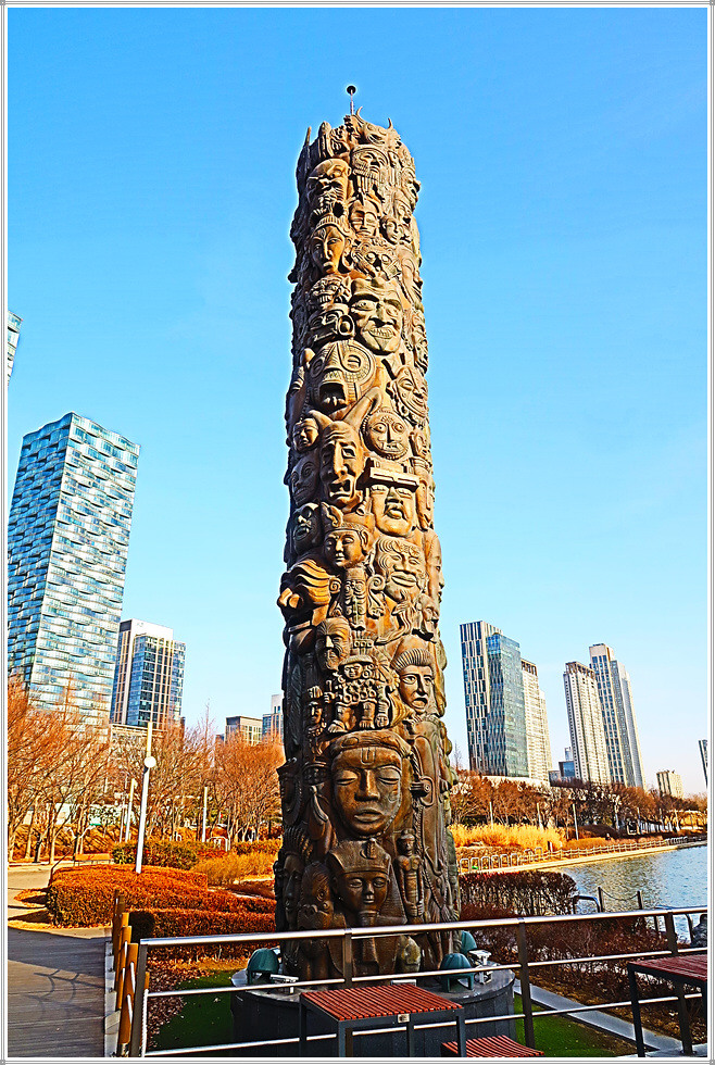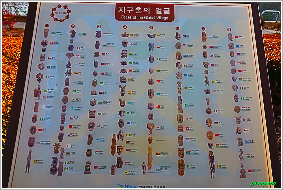 육교를 건너 맞은 편 호숫가로 갑니다. 포옹(양진옥 작)이라는 주제의 작품이 앙증맞습니다. 기지개를 켜는 호랑이(이다민 작)라는 작품도 보이네요. 우측 언덕에 있는 국립세계문자박물관을 뒤로하면 지구촌의 얼굴이라는 원통형 타워조형물을 만납니다. 이 작품은 세계 120개 나라를 상징하는 탈을 쌓은 것으로 각 나라의 고유한 민족정서를 반영한 대표적인 작품입니다.